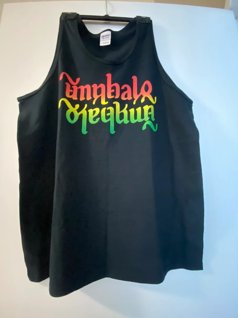 Black tank top with a (Rasta) multi-coloured graphic design. Retail $20 US.