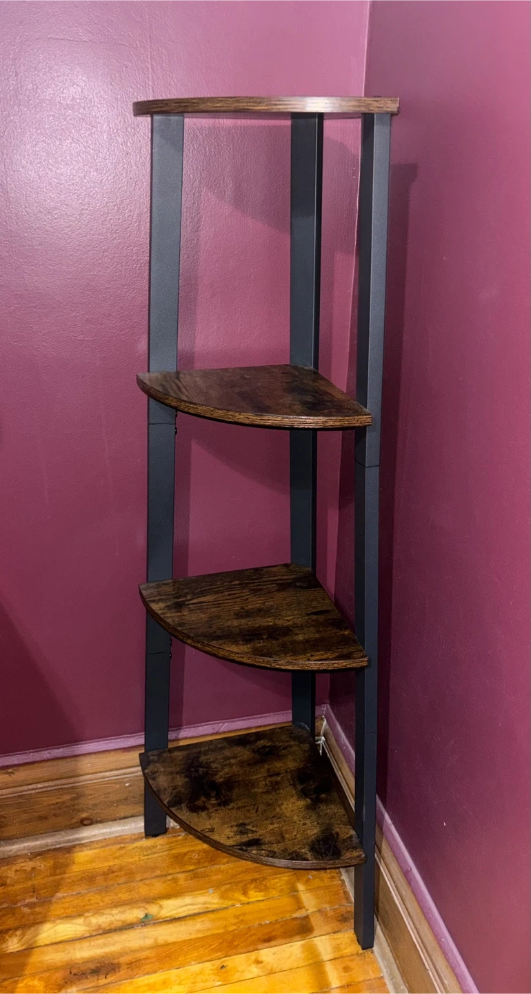 This is a rustic style corner shelf unit with a dark wood finish and black metal frame. It has four tiers and is perfect for displaying plants or books.
