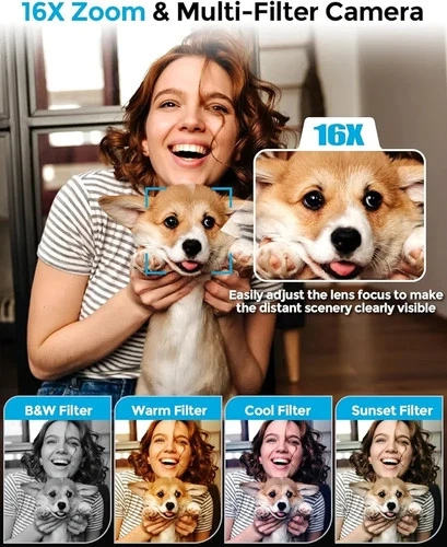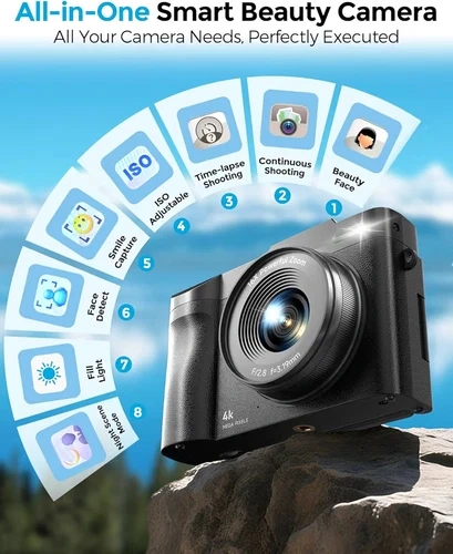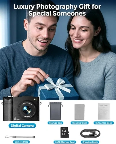 Capture life in vivid detail with this 4K digital camera. It shoots ultra-clear 4K videos at 30FPS and stunning 50MP photos. The 2.8" IPS 180° flip screen makes vlogging and selfies easy. It can also function as a webcam when connected via USB. Includes a 1500mAh rechargeable battery and a 64GB SD card, offering long shooting sessions. Perfect for beginners, travel, and content creation. Let me know if you're interested!