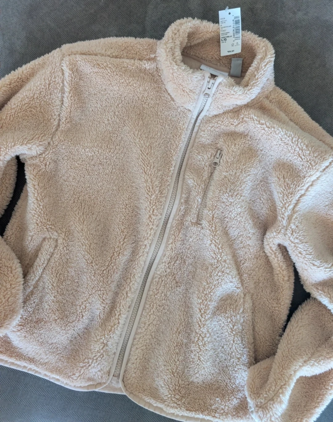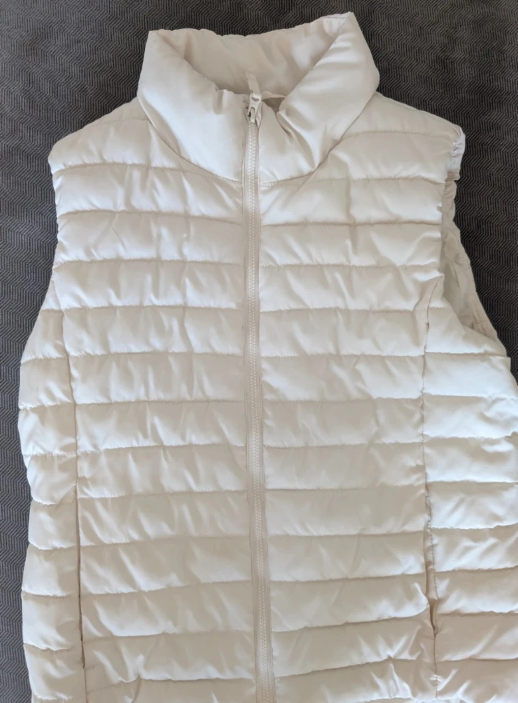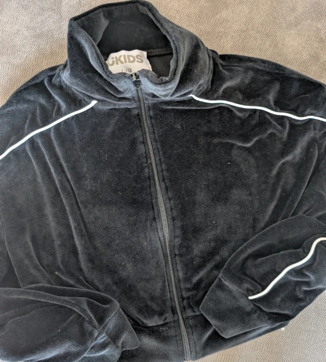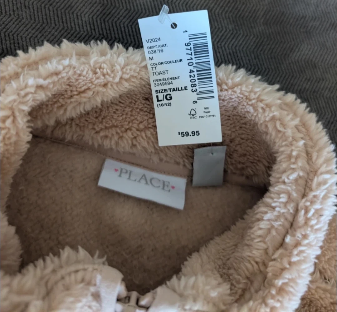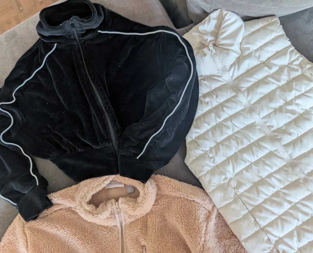 This bundle includes an Old Navy Active cream puffer vest, size XL (14-16). It also features a beige fleece jacket from The Place, size L (10/12), with a full zip closure and pockets and a velour zip up size 10/12. All are great for layering during cooler weather!