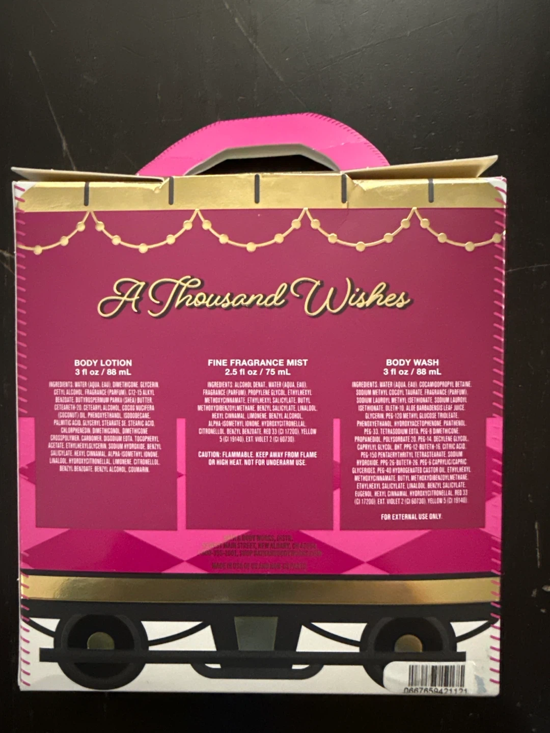 This cute set comes in a "Candy Care Car" themed box. It includes a 3 oz / 88 ml body lotion, a 2.5 oz / 75 ml fine fragrance mist, and a 3 oz / 88 ml body wash. All items are from the "A Thousand Wishes" scent collection.