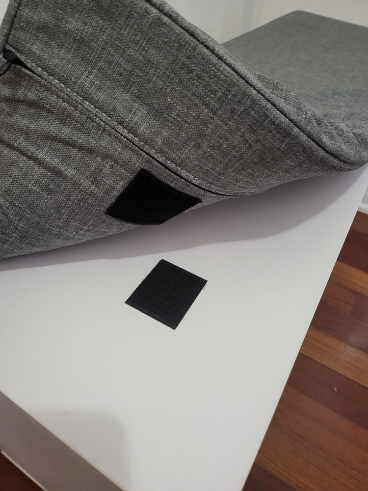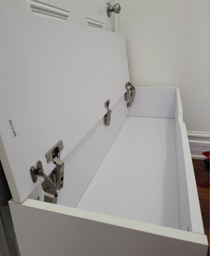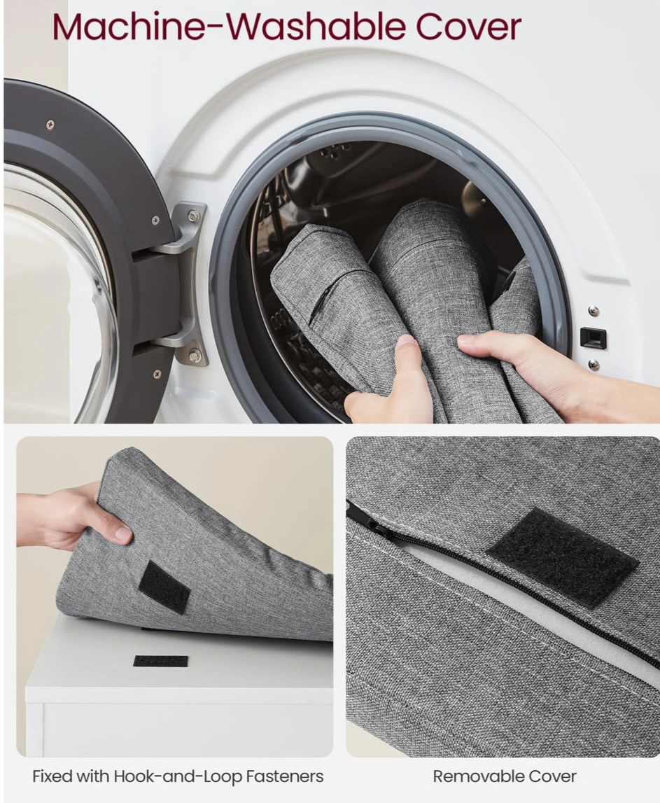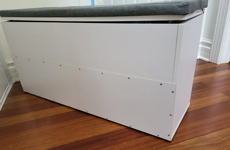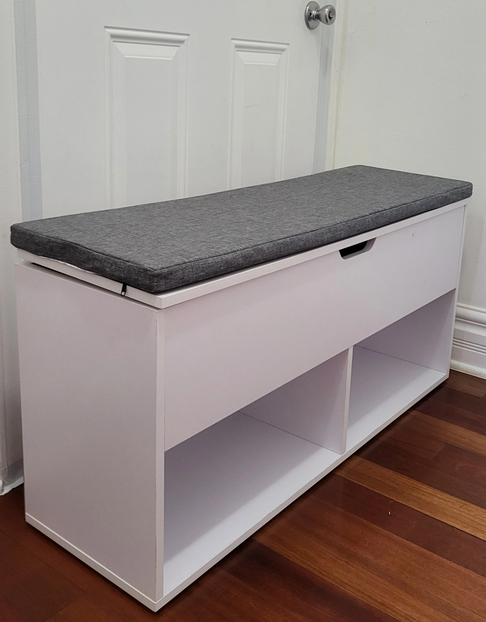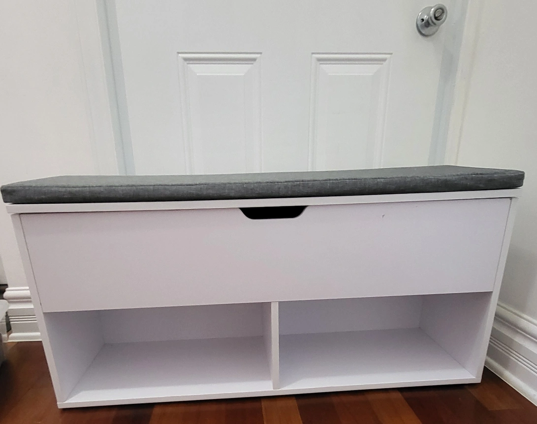 I'm selling a storage bench in great condition! It's white with a comfortable gray cushion on top. The cushion cover is machine-washable and easily removable.
