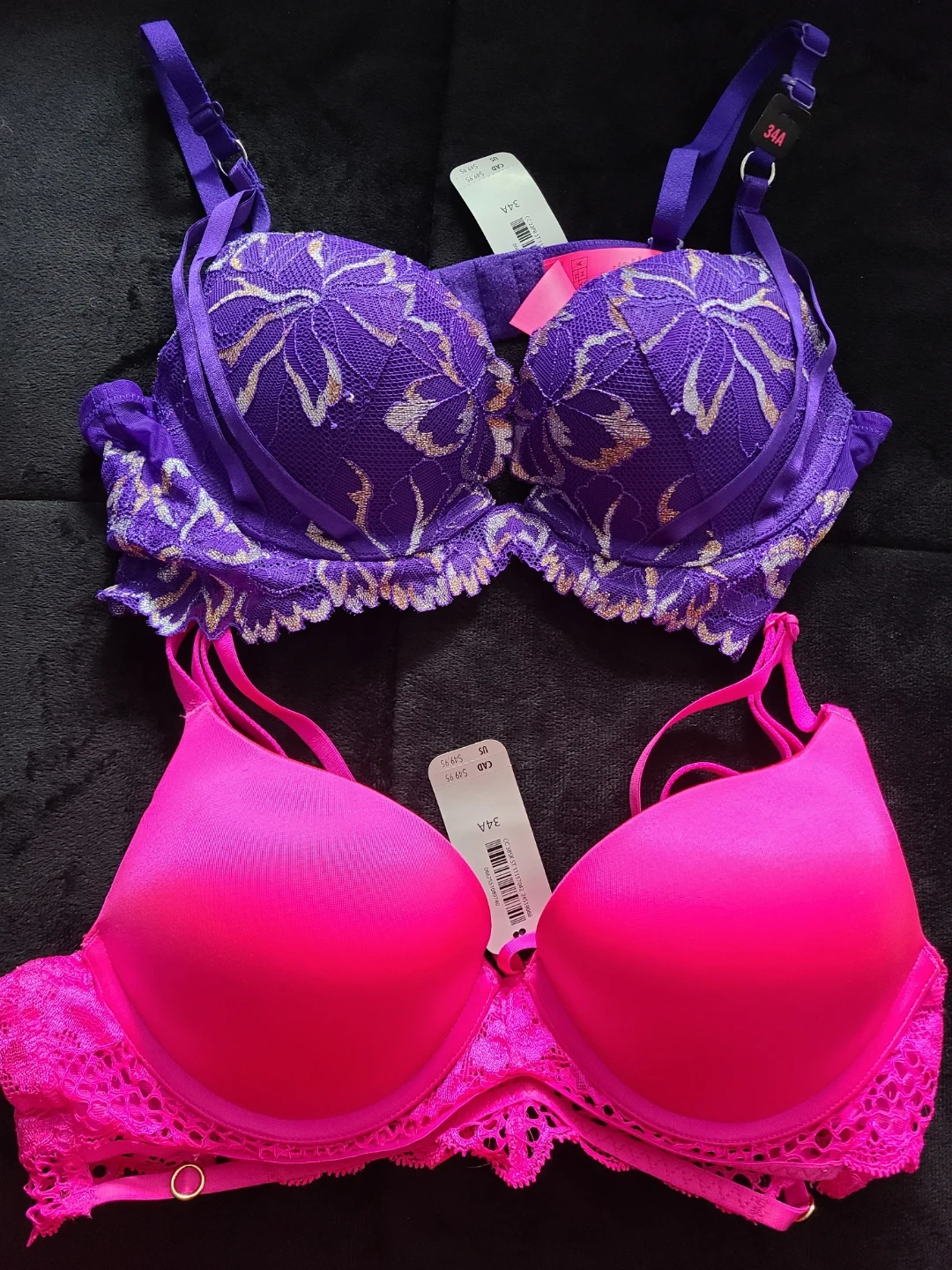 Two brand new bras from La Senza. One vibrant pink and one deep purple. Both are size 34A and feature delicate lace detailing. They're perfect for adding a pop of colour to your everyday wear!