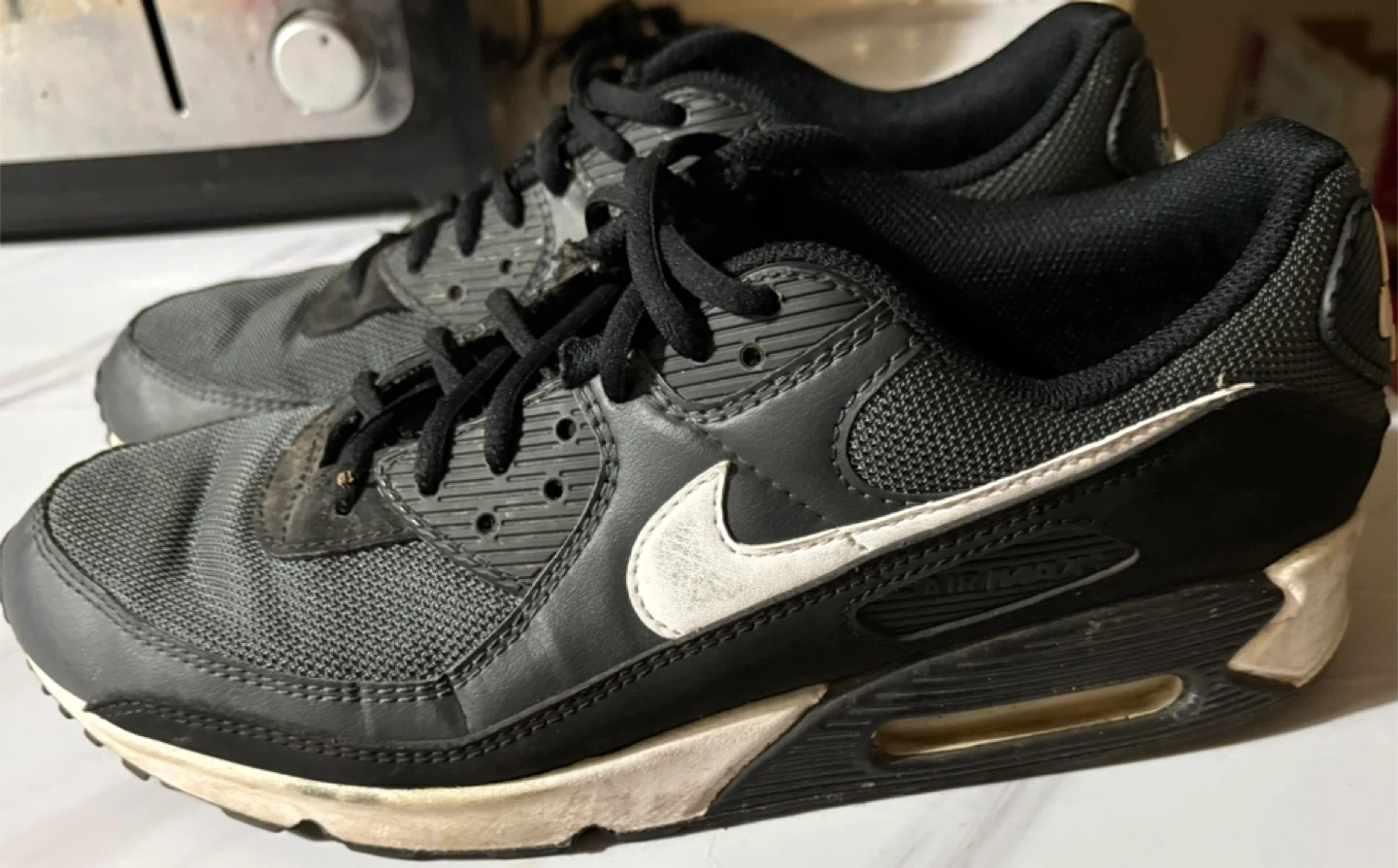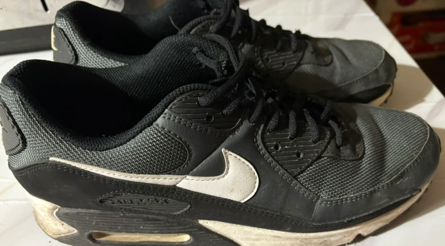 These are black and white Nike Air Max 90 sneakers. They feature the classic Air Max cushioning system. Great for casual wear or light athletic activities. Decent shoes make good work shoes or something old don’t really wear in just seeing if there any interest in em