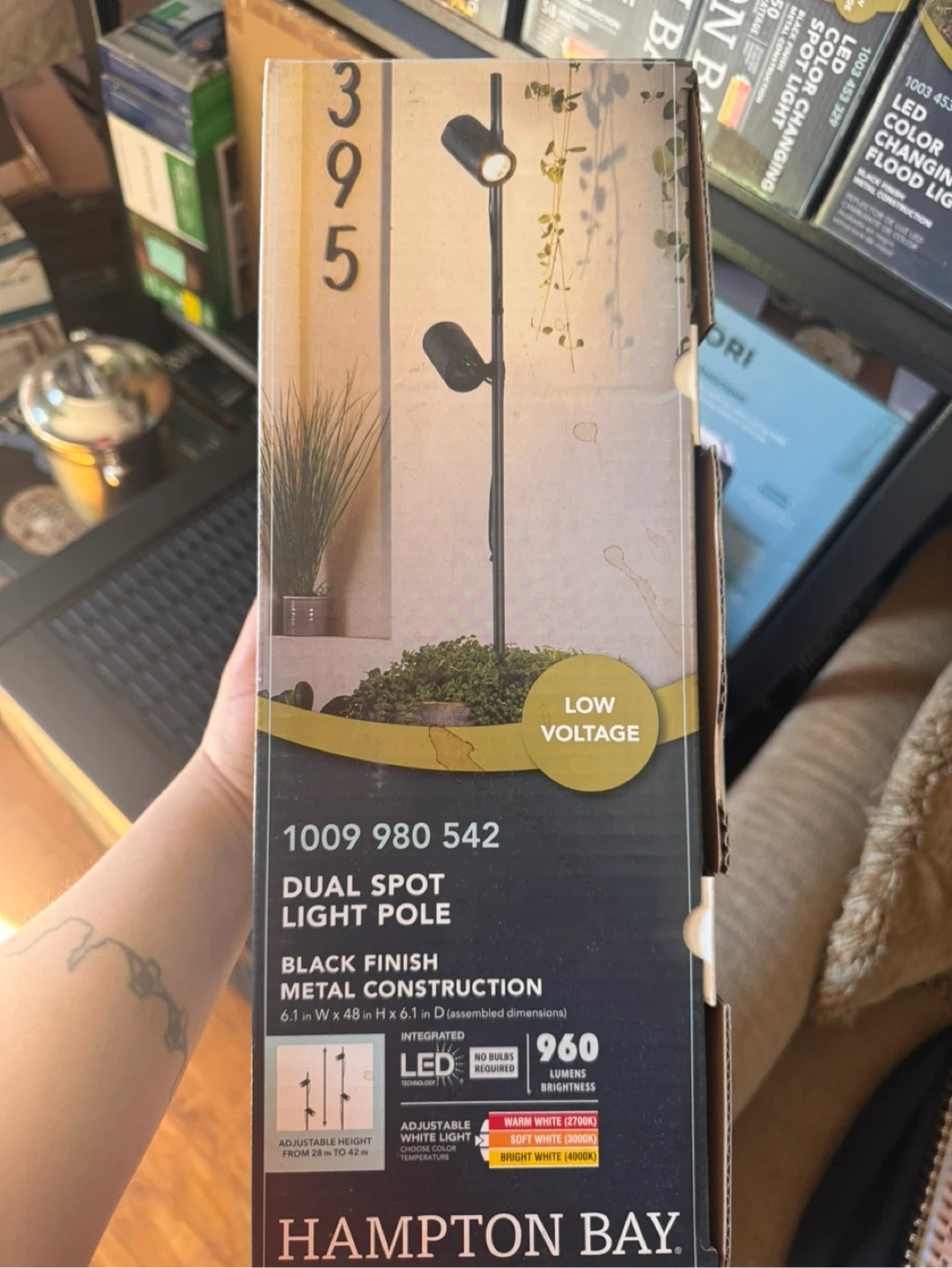 This is a Hampton Bay dual spot light pole. It's black finish metal construction with integrated LED technology. The adjustable height ranges from 28 inches to 42 inches and it provides 960 lumens brightness. You can choose between warm, soft, or bright white light temperatures!