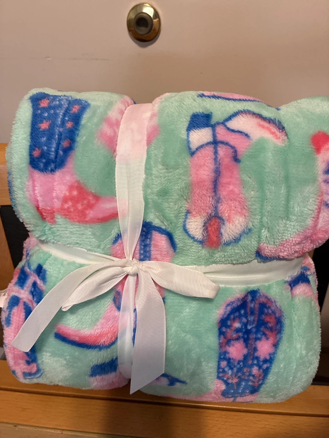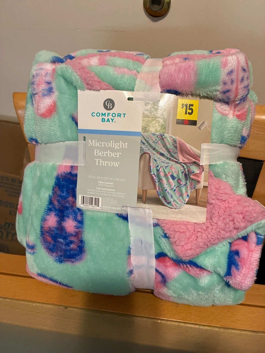 This Comfort Bay microlight berber throw blanket measures 50 in x 60 in (127 cm x 152 cm). It's made of 100% polyester. Machine washable on cold, tumble dry on low. This cozy throw is perfect for snuggling up on the couch!