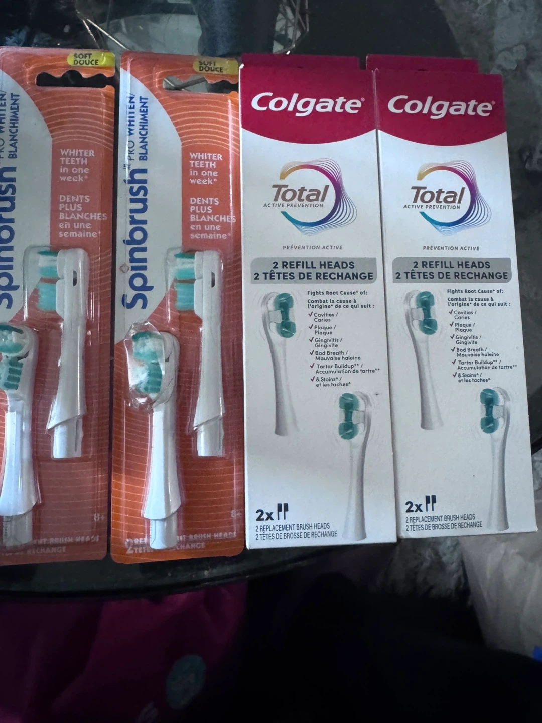 Get two packs of Colgate Total Active Prevention replacement brush heads. Each pack contains 2 refill heads, for a total of 4 brush heads. These are designed to fight cavities, plaque, gingivitis, bad breath, tartar buildup, and stains.