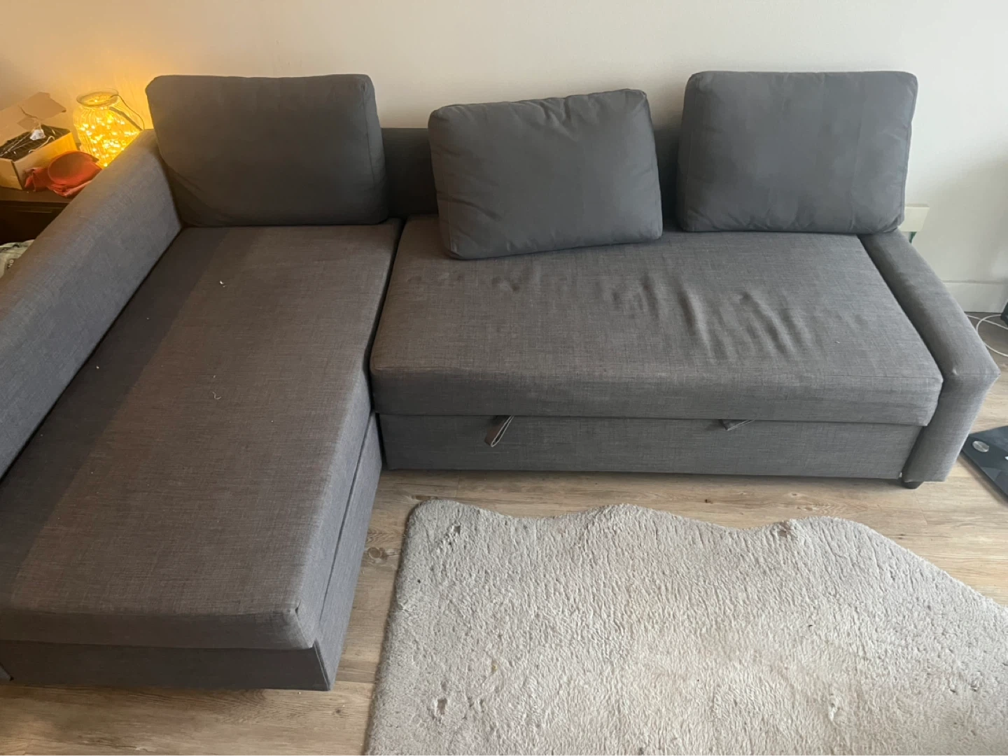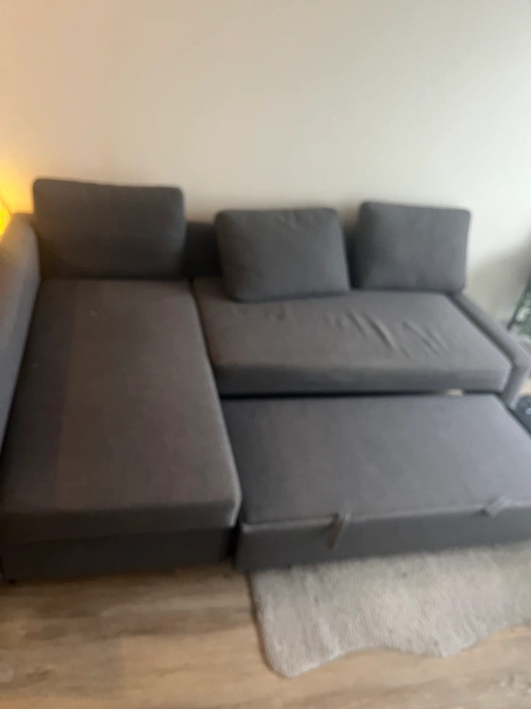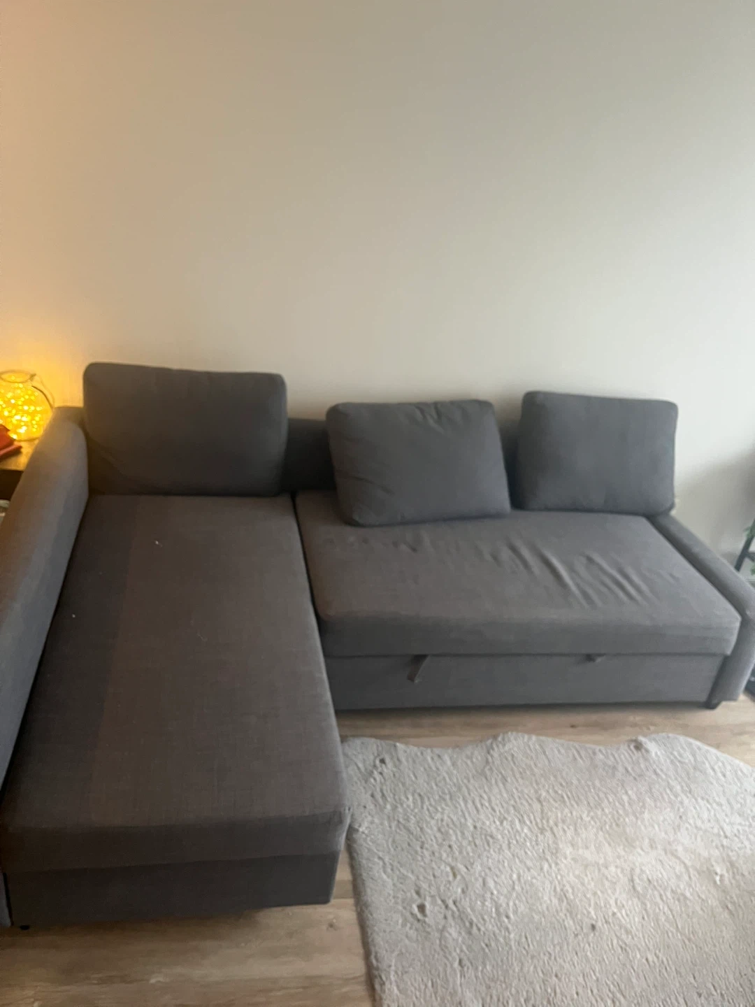 This sectional sofa pulls out into a bed, and has storage underneath. It's a dark grey fabric. Perfect for small spaces needing a sofa and a guest bed!