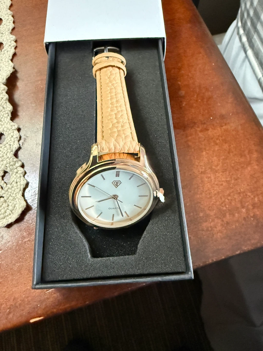 Selling a quartz watch with a tan leather band! It comes with its original box. The watch features a gold-tone case and a clean, minimalist design. Perfect for adding a touch of elegance to any outfit. I have 2 of them. Selling for $10.00 each !!!!!