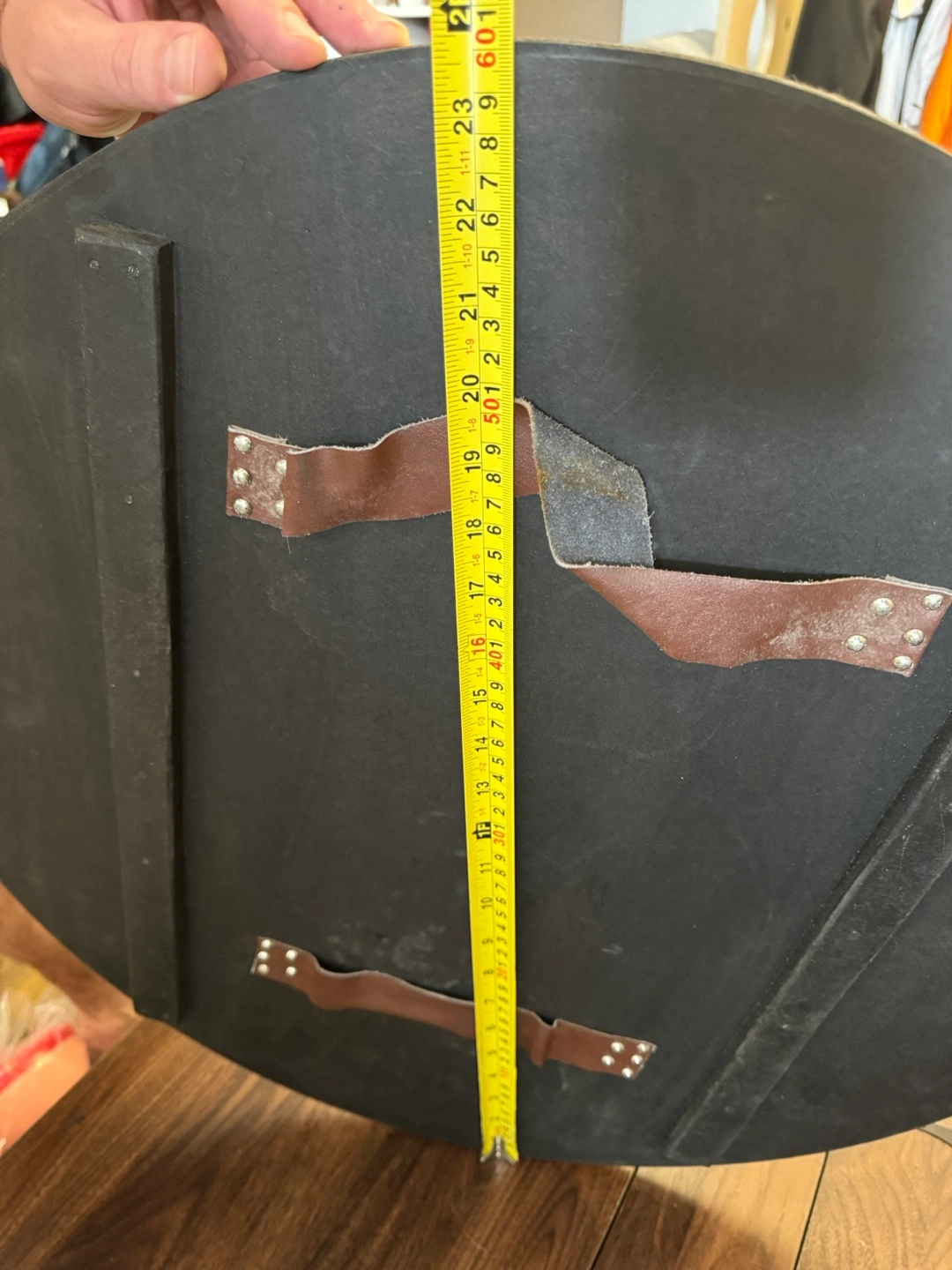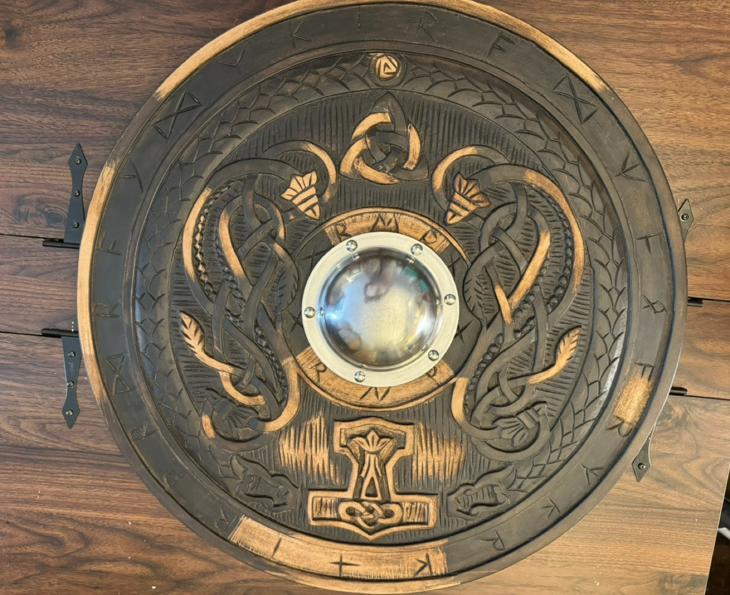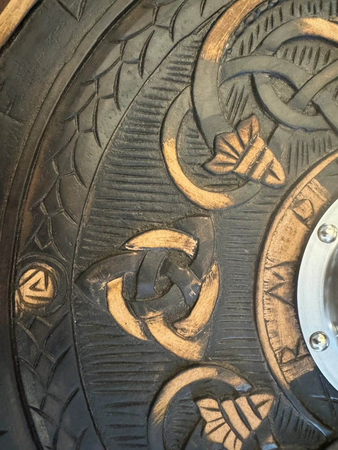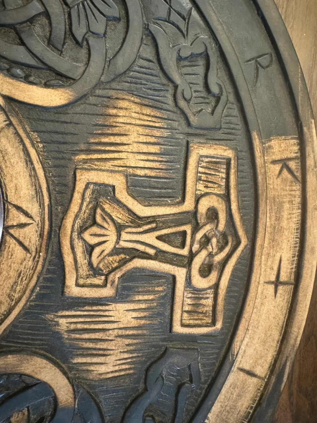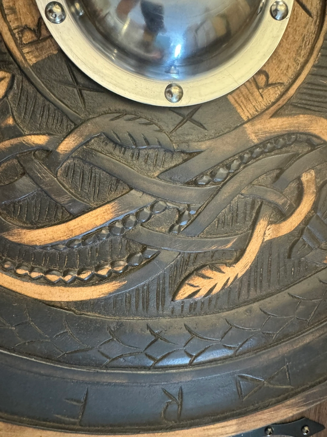 Large round shield. Intricate carvings. Features Mjolnir and runes. Leather straps on the back. Metal boss in the centre. Unique design. Great for display.