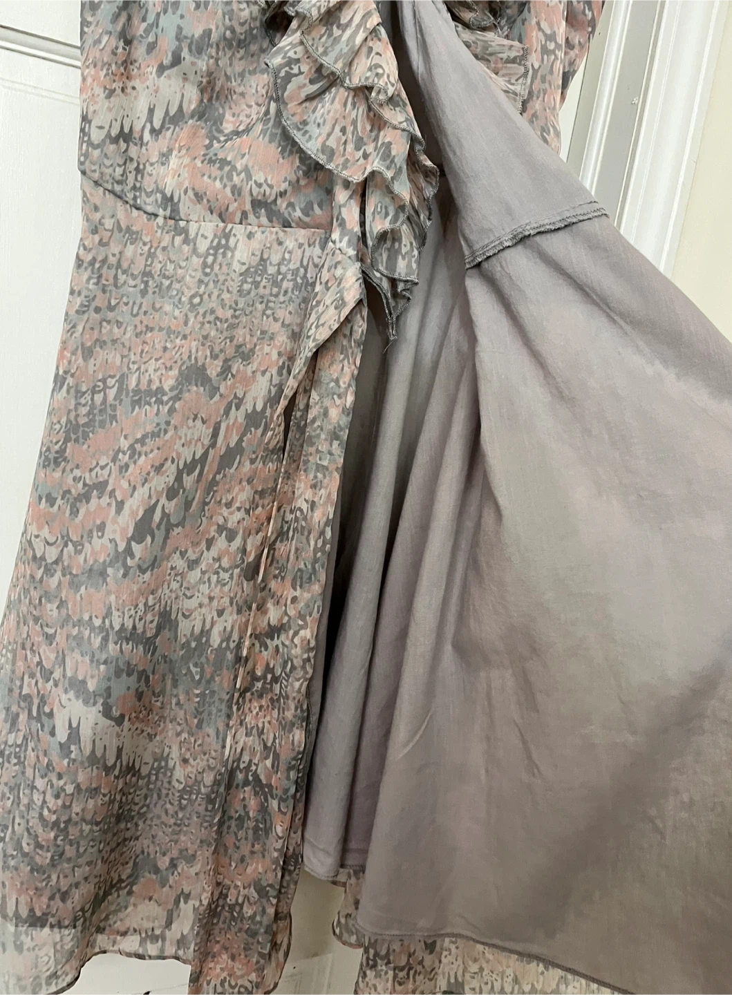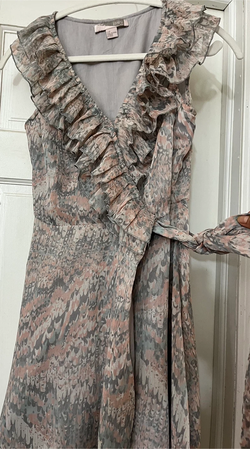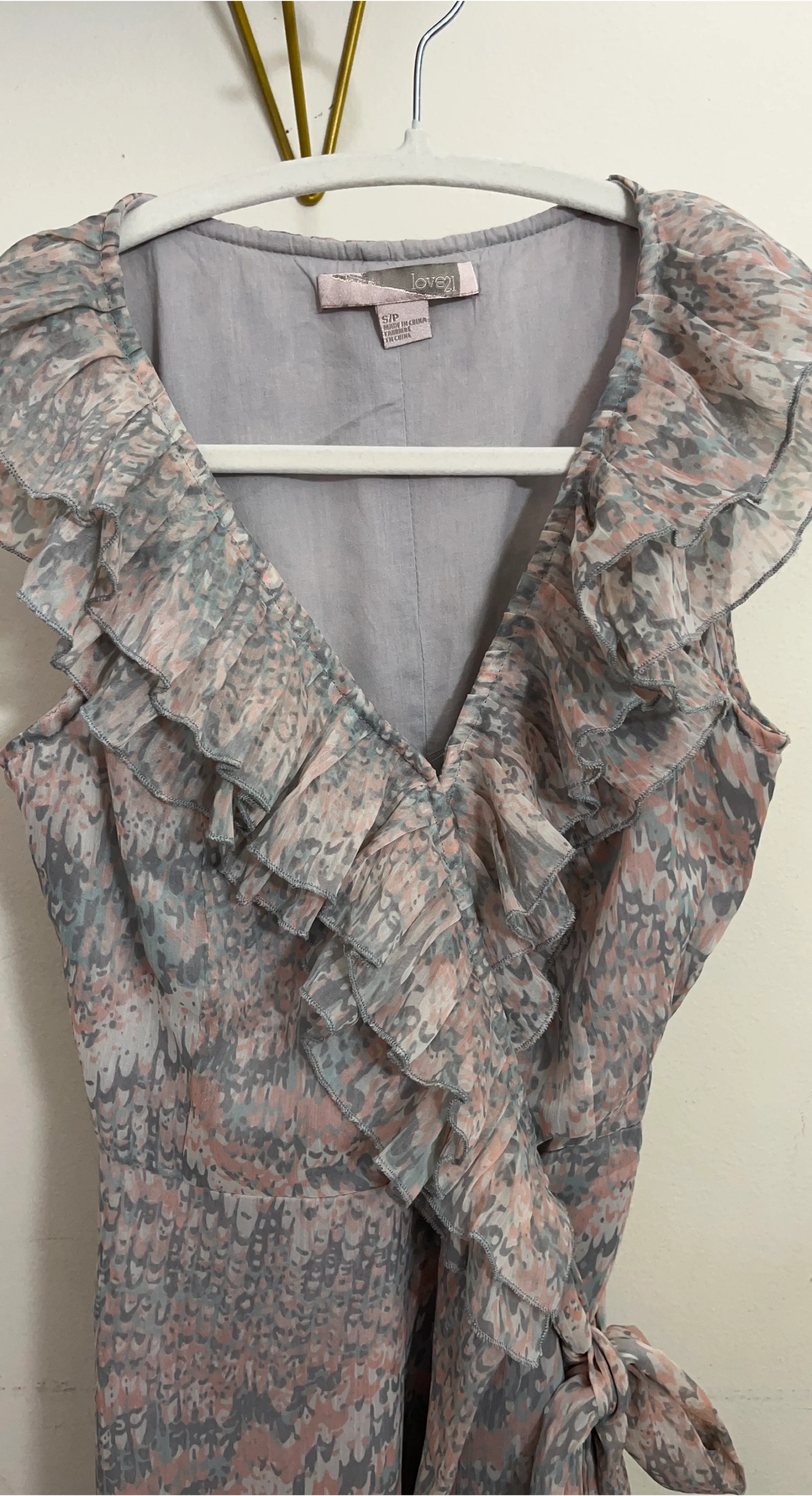 This Love21 dress features a colorful abstract print with ruffled details. It has a V-neckline and a tie waist. Lightweight fabric.100% polyester.