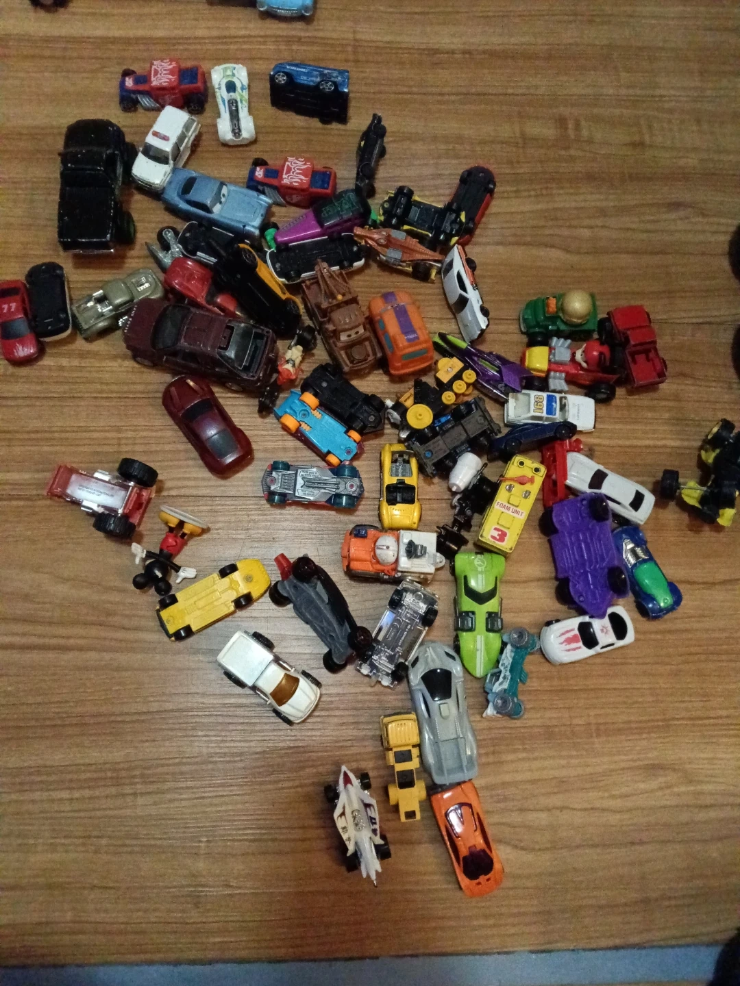 This is a large collection of assorted toy cars. The lot includes various vehicles in different colors and styles. They're made of metal and plastic.