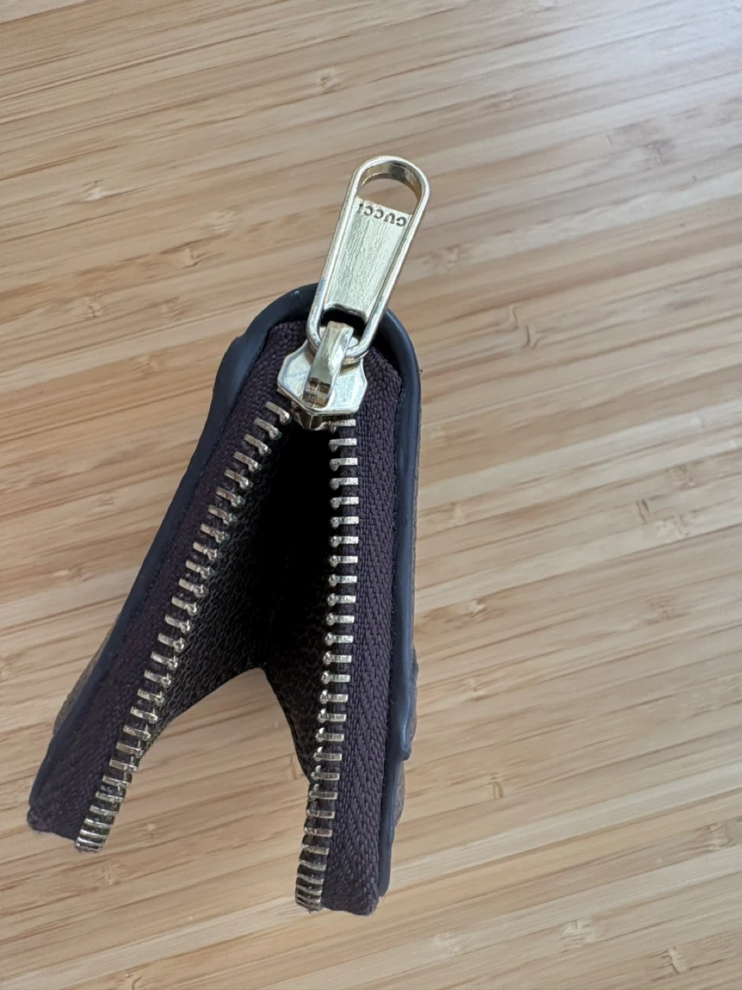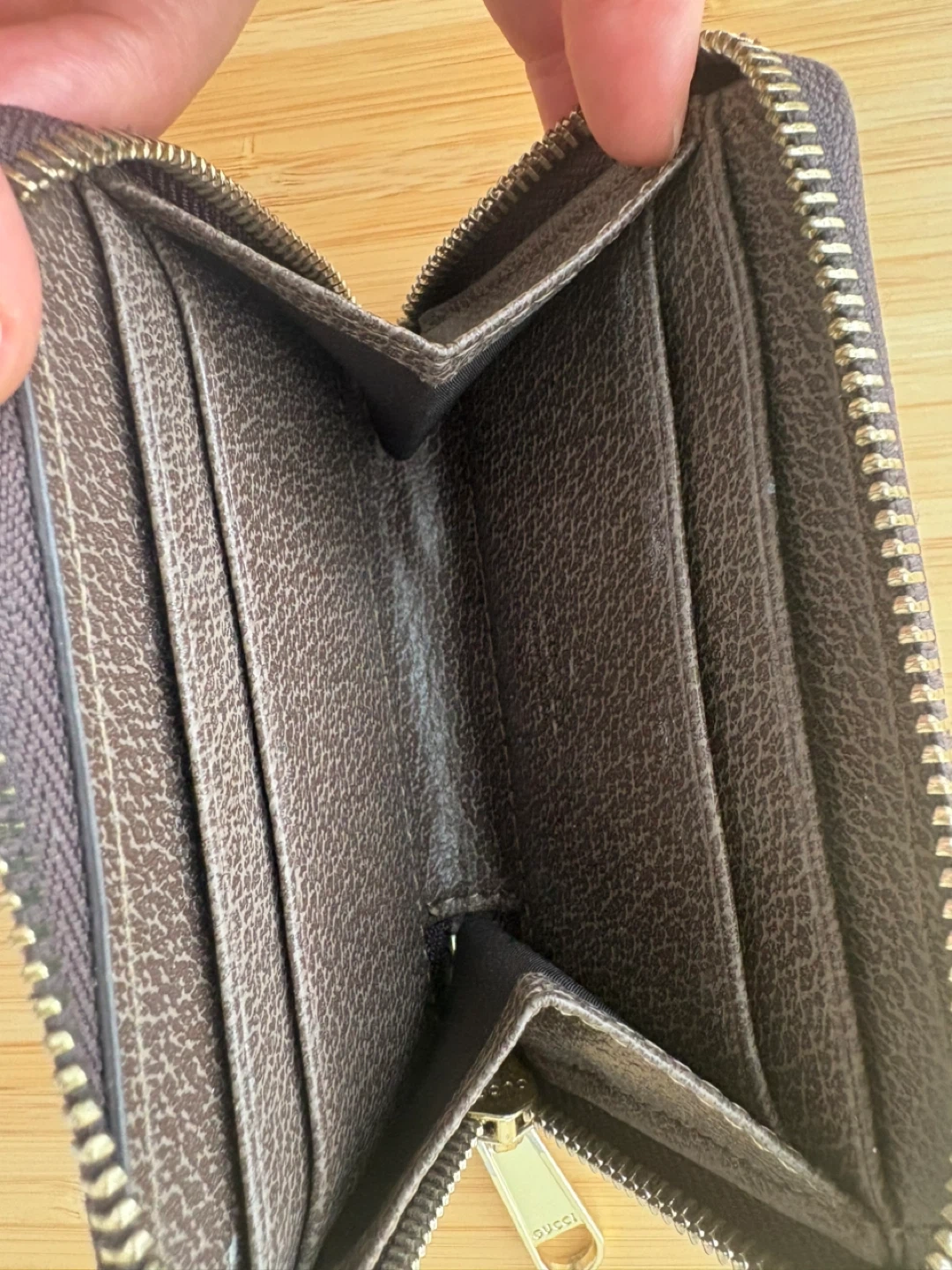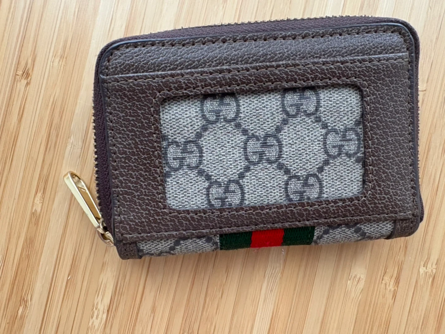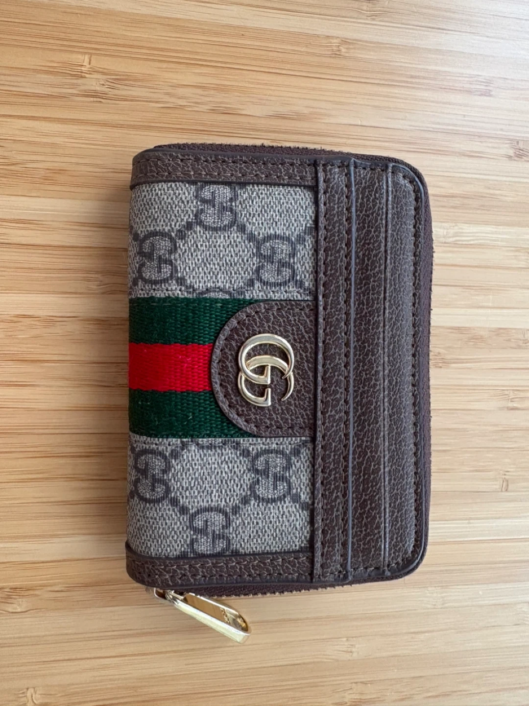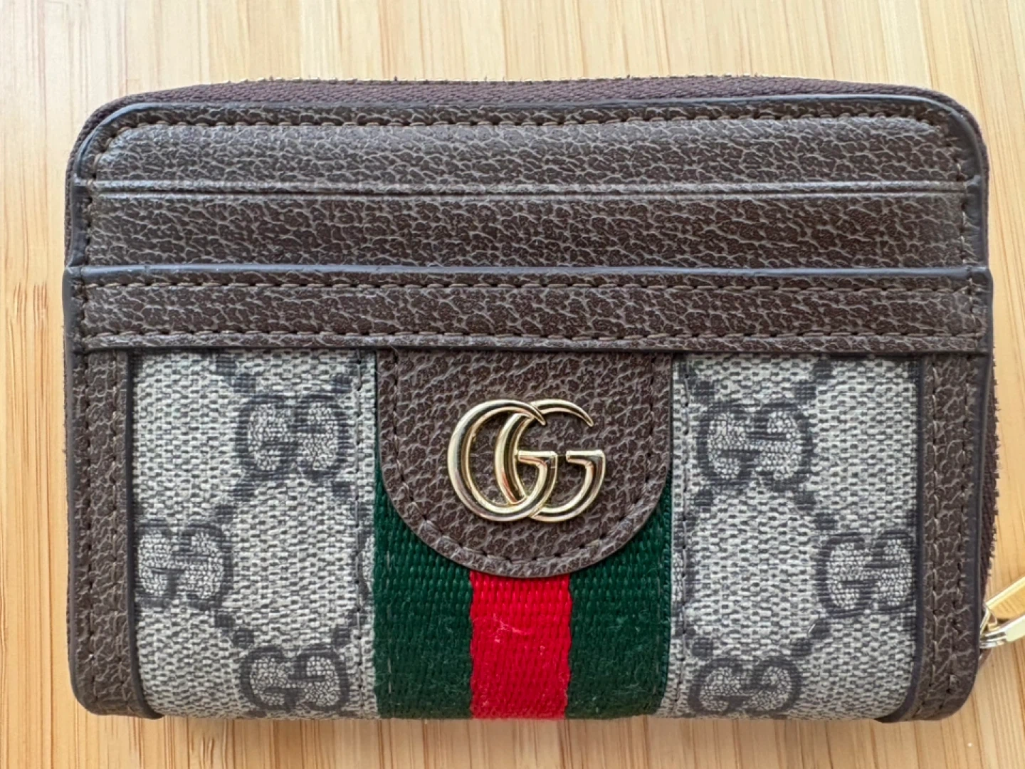 A stylish Gucci zip-around wallet featuring the iconic GG monogram. It has multiple card slots and a central compartment for coins or folded bills. Crafted from leather and canvas.