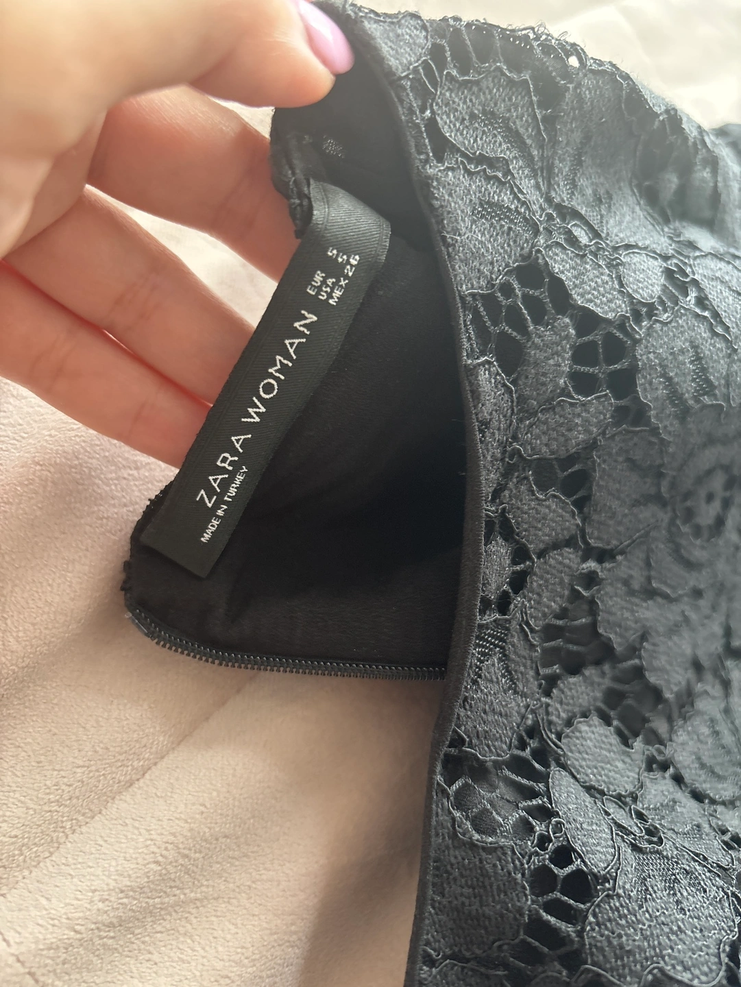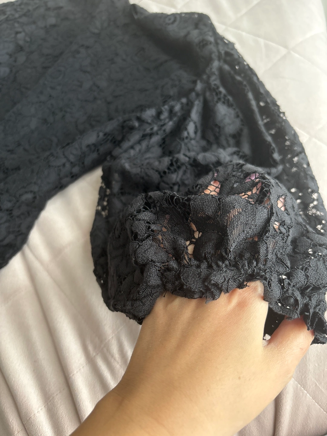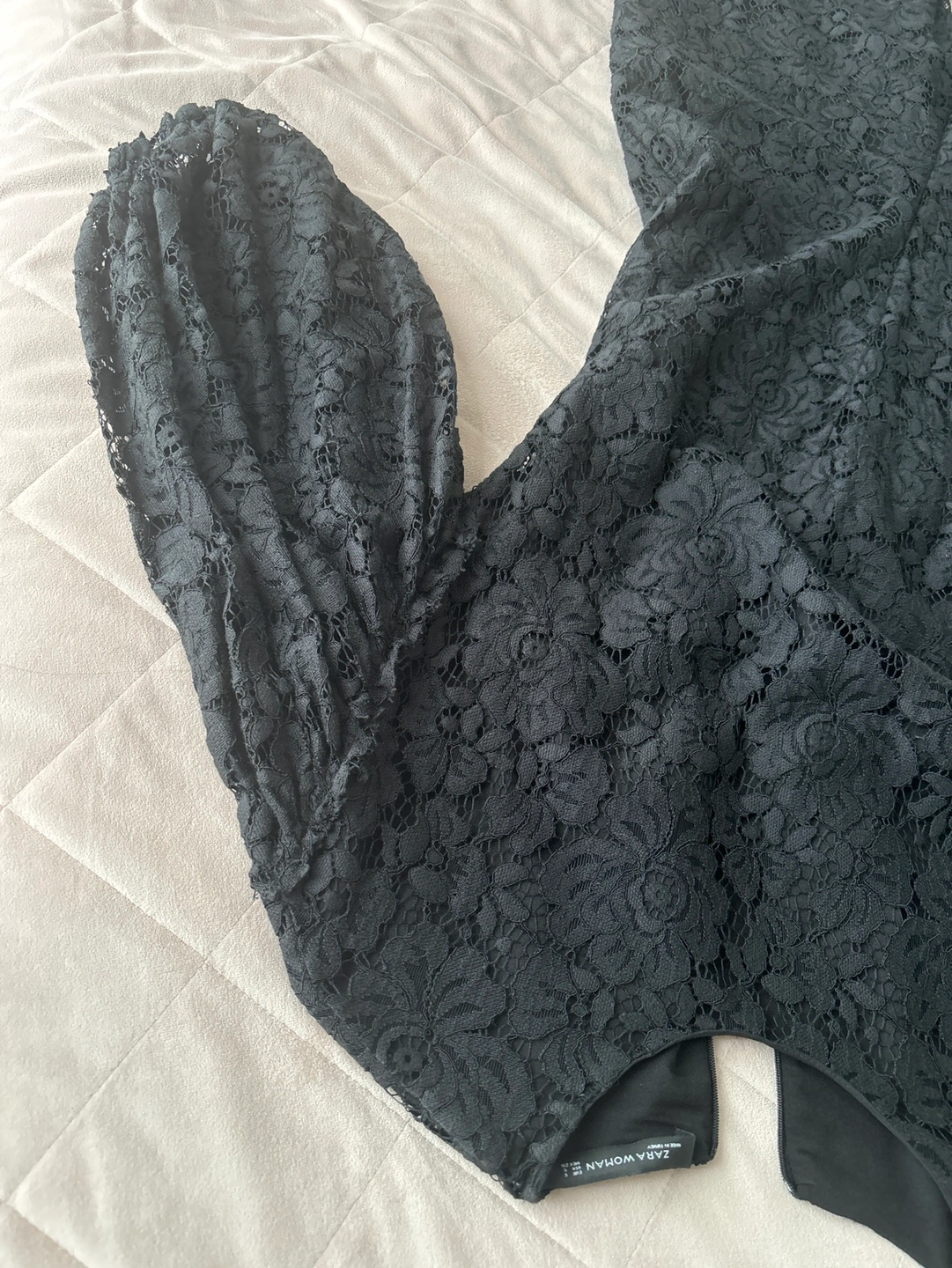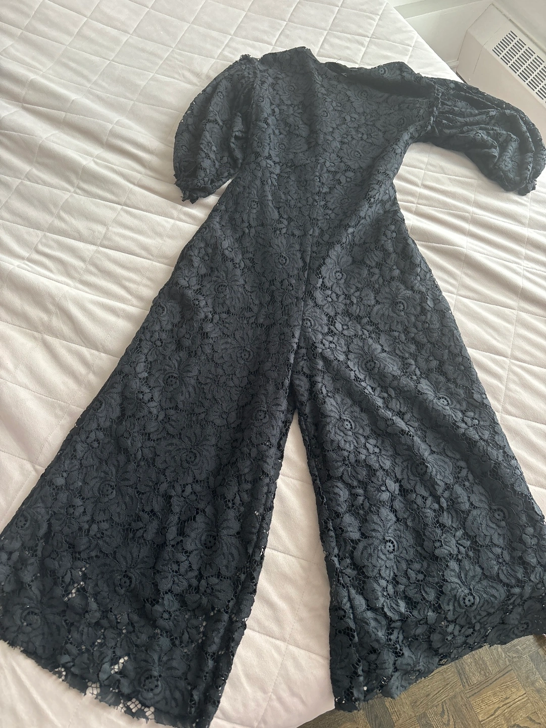 Black lace jumpsuit with puff sleeves.The jumpsuit has a zipper closure in the back. The size tag indicates size S/USA 4/MEX 26.