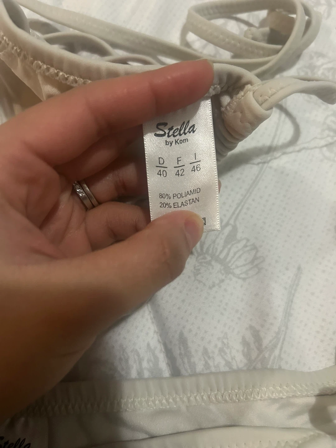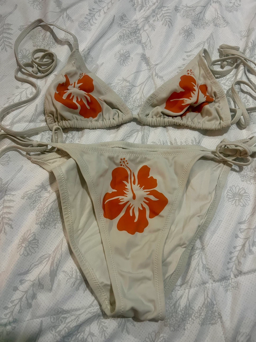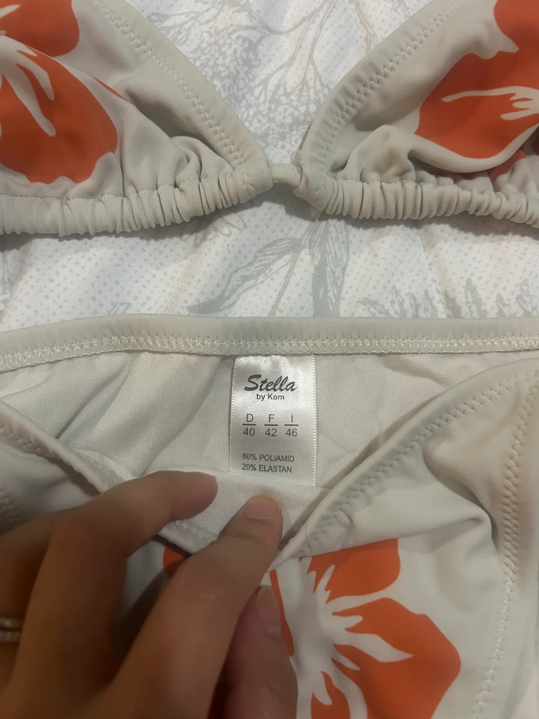 Brand new Cream bikini set by Stella by Kom with an orange hibiscus print. It's made of 80% Polyamid and 20% Elastan. Size is listed as 40, 42, 46.