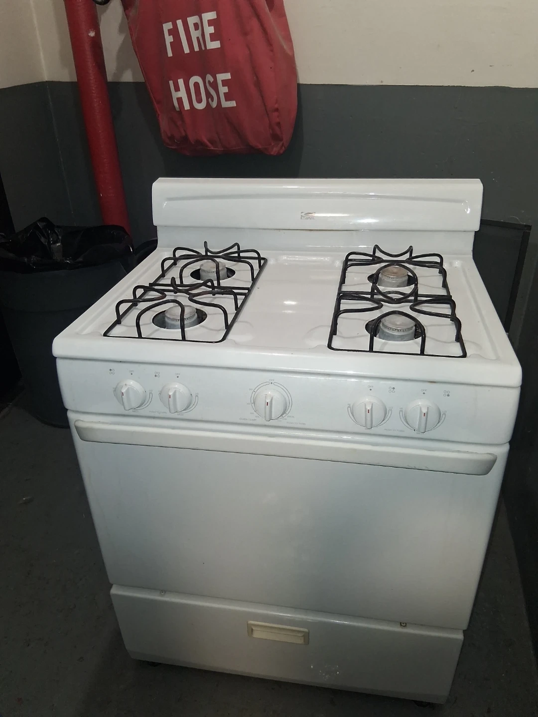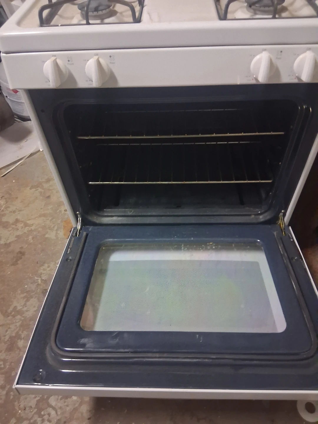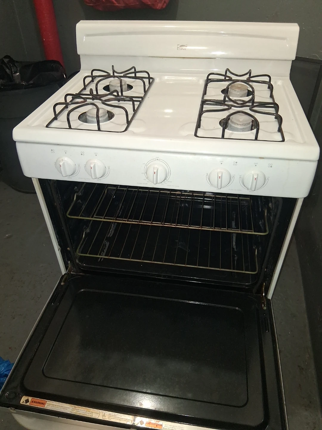 This is a white Whirlpool 4-burner gas stove with an oven. It features a standard cooktop with four burners and an oven with two racks inside. Perfect for everyday cooking needs!