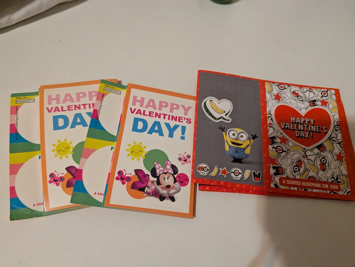This set includes four Happy Valentine's Day cards. Three feature a rainbow and butterfly design, while one has Minnie Mouse. There's also a bonus scented bookmark featuring Minions. These are great for kids to hand out at school!