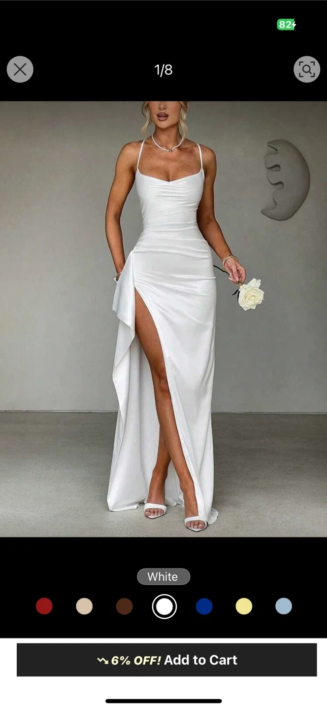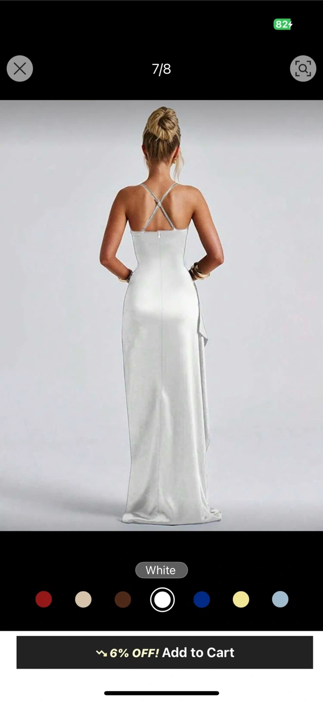 This elegant white maxi dress features spaghetti straps and a flattering ruched bodice. It has a daring high slit on one side with a draped overlay detail. The back has criss-cross strap detailing.