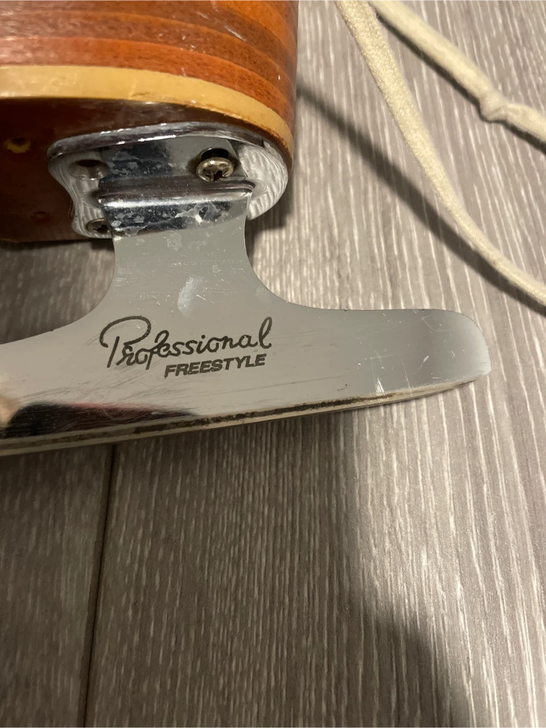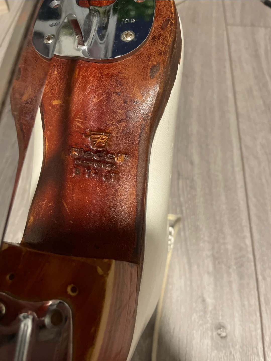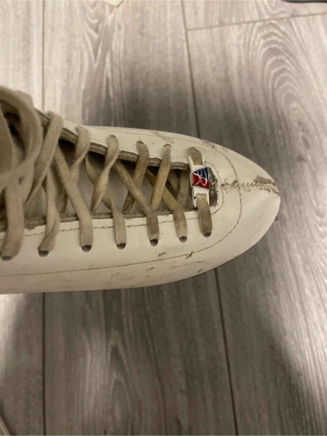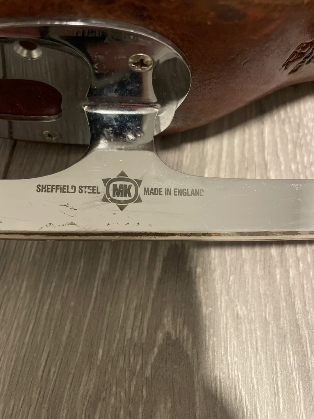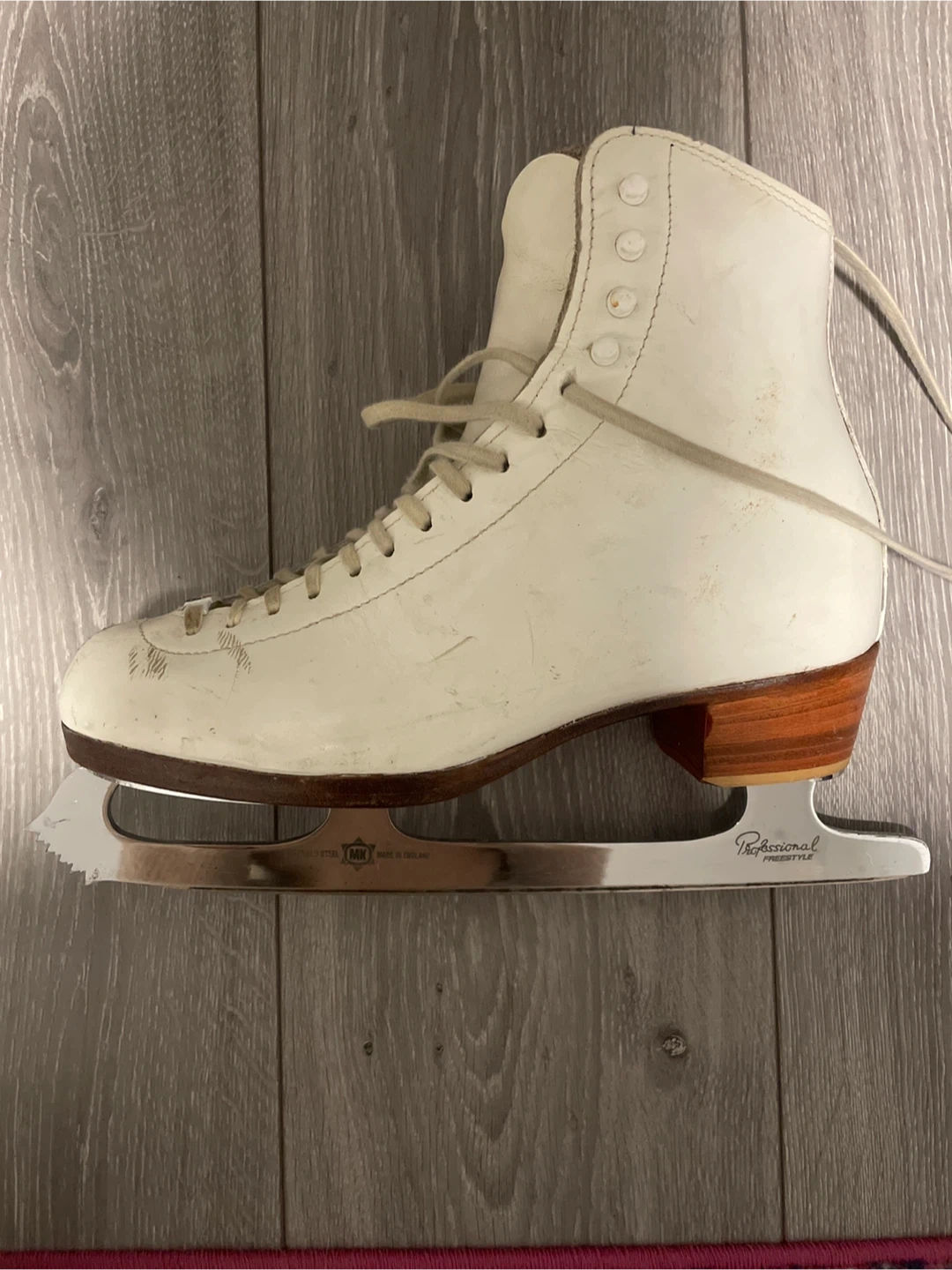 These are an older model of Riedell 320 with thick cushioning and a solid wood sole. No wobbly ankles here! Suitable for jumping or just recreational skating. Blades are Sheffield Steel MK professional freestyle. Size 7.5