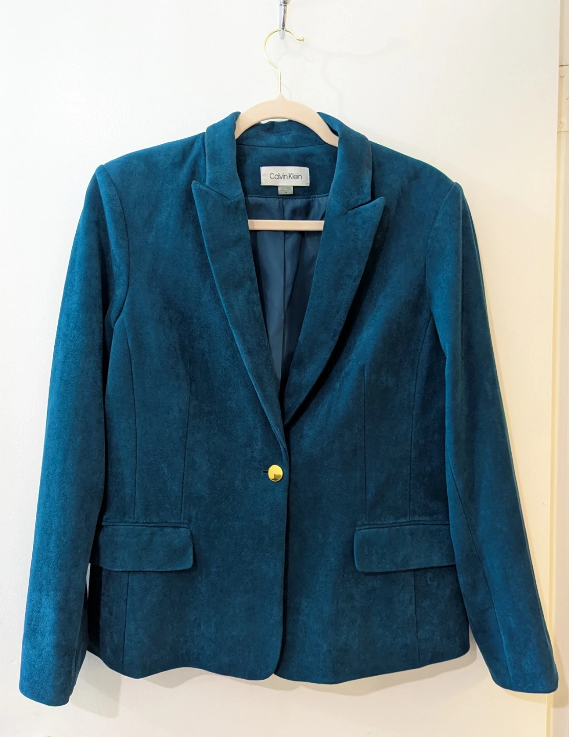 This is a Calvin Klein teal velvet blazer. It's a size 14 and features a single gold-tone button closure and two flap pockets. It's fully lined with a deep teal fabric.