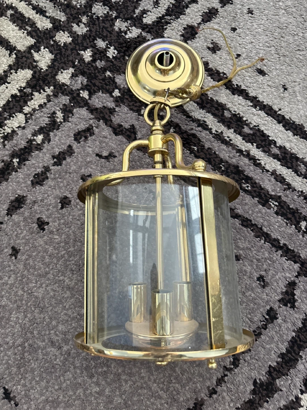 This is a classic pendant light fixture with a brass finish and clear glass shade. It's designed to hold three bulbs. The fixture is suitable for entryways or hallways. It comes with a mounting chain and canopy.
