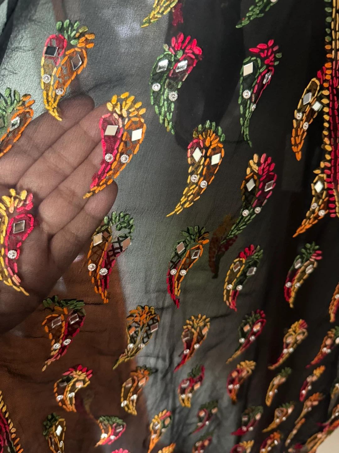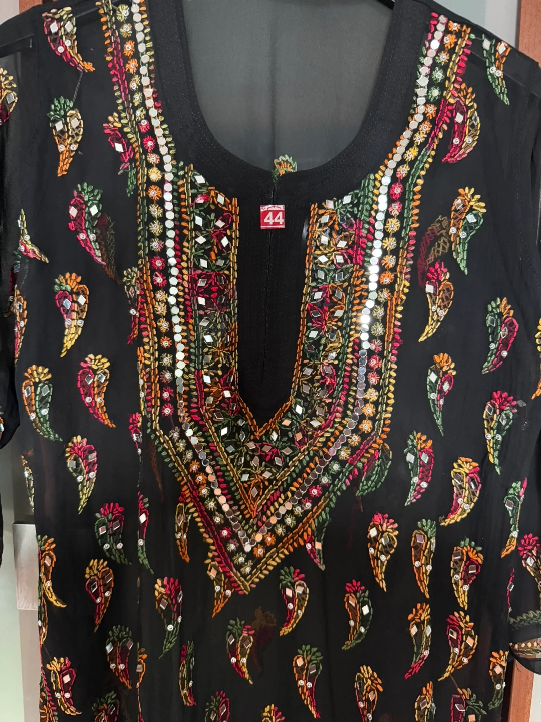 A beautiful black kurti featuring colourful paisley embroidery and mirror work. It's a size 44 with elbow-length sleeves. This piece is perfect for festive occasions or everyday wear.