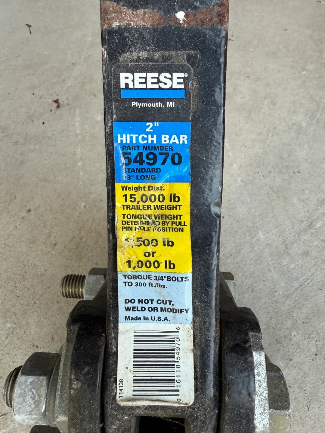 Selling a Reese 2" hitch bar, part number 54970. It's a standard 3" long hitch bar. It has a weight distribution of 15,000 lb trailer weight and a tongue weight determined by full pin hole position of 500 lb or 1,000 lb. Torque is 3/4" bolts to 300 ft./lbs