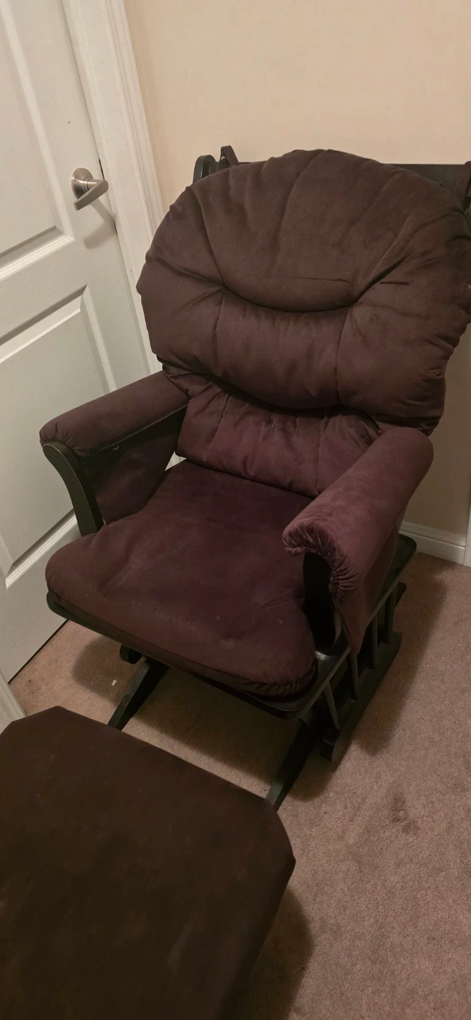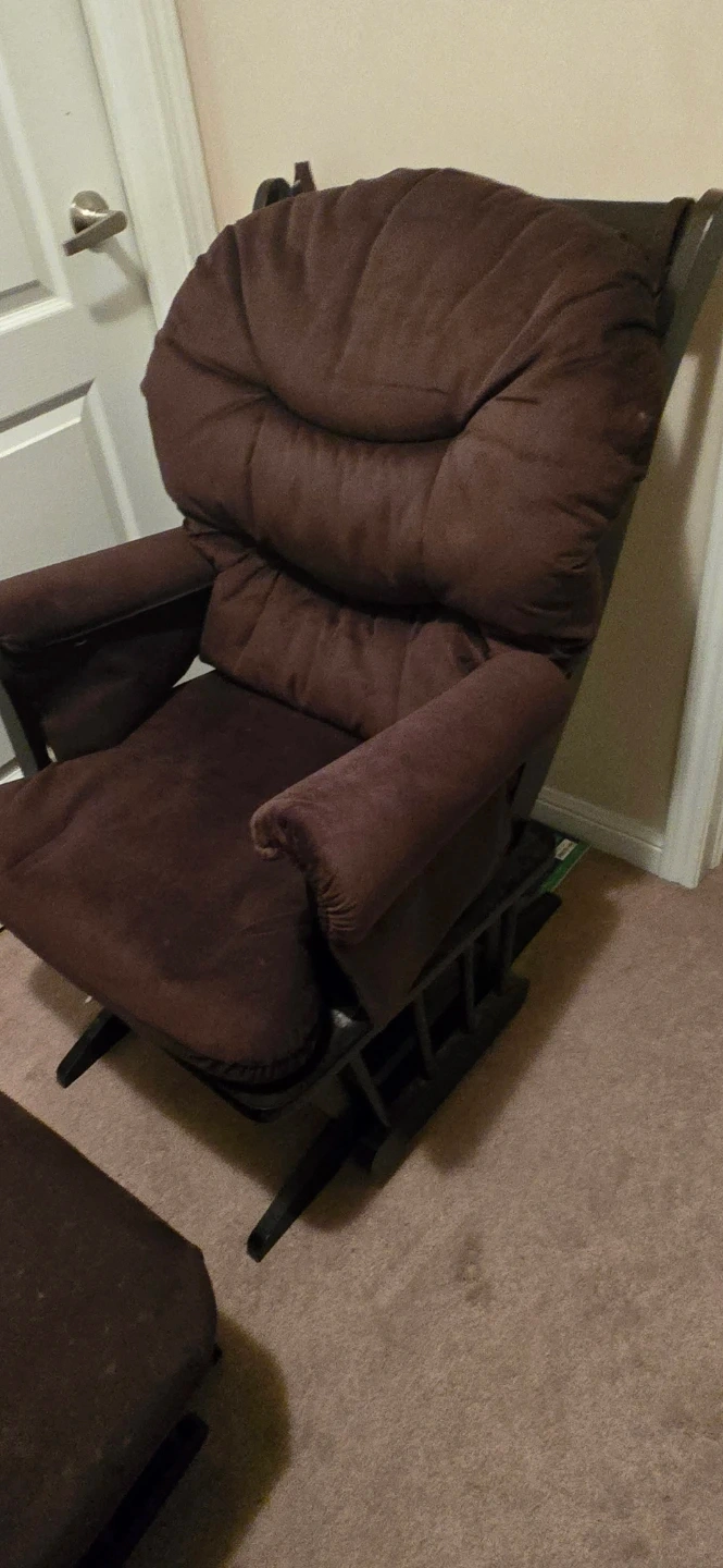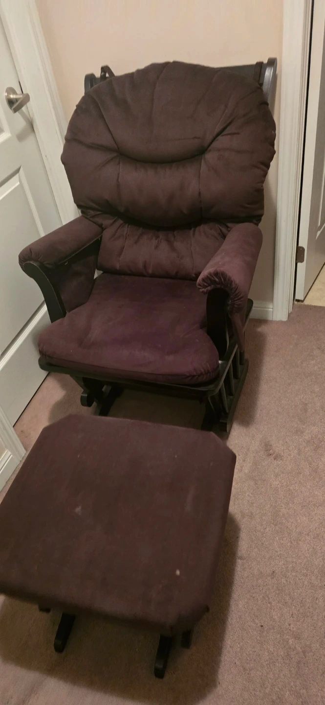 Comfortable brown glider rocker chair with a matching ottoman. Upholstered in a soft, plush fabric. It's perfect for a nursery or living room seating.