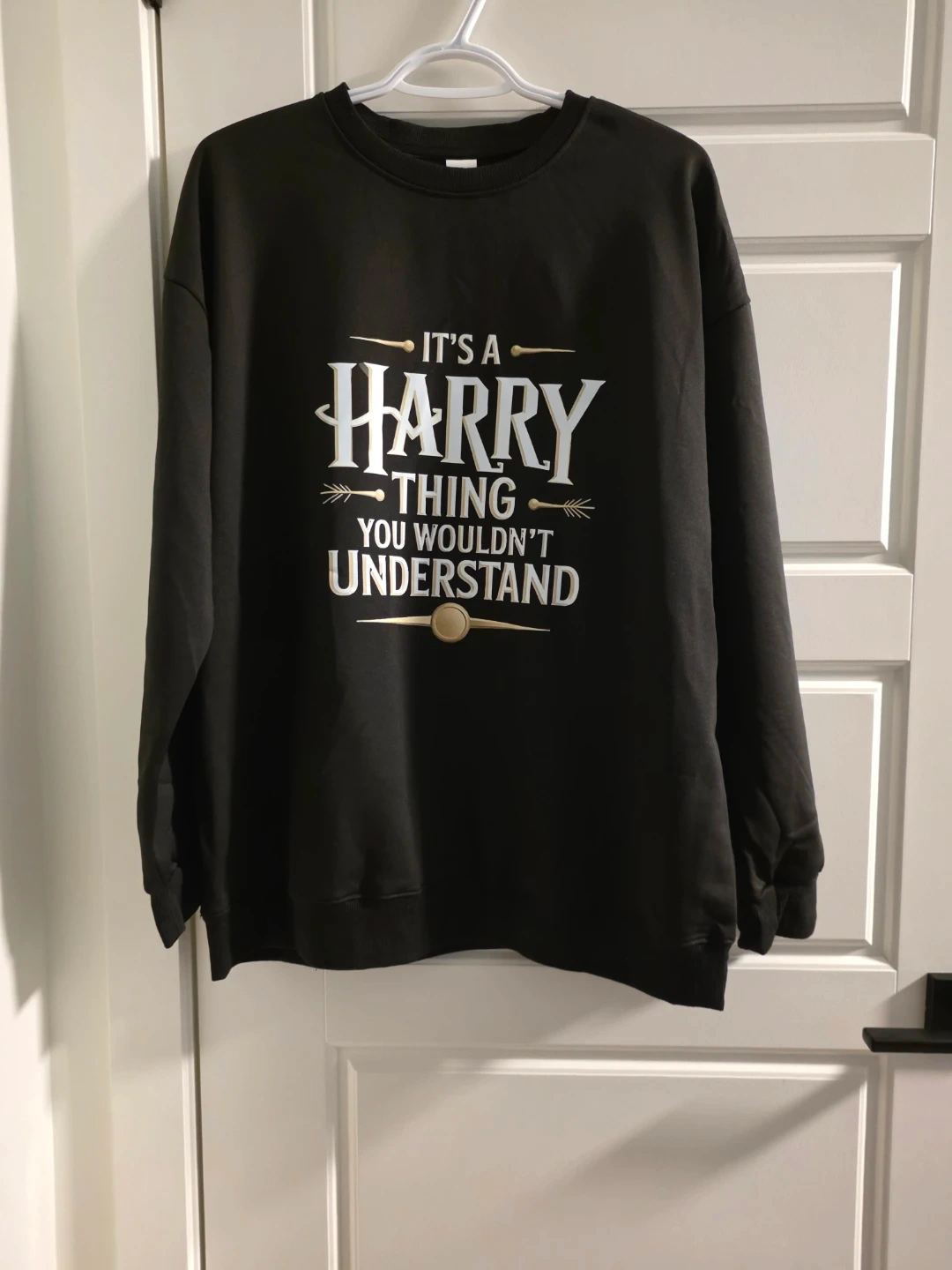 This black crewneck sweatshirt features the phrase "It's a Harry Thing You Wouldn't Understand" in a stylish font. It's made of 100% polyester and is a size XL. Great for any Harry! It's comfy and perfect for cooler weather.