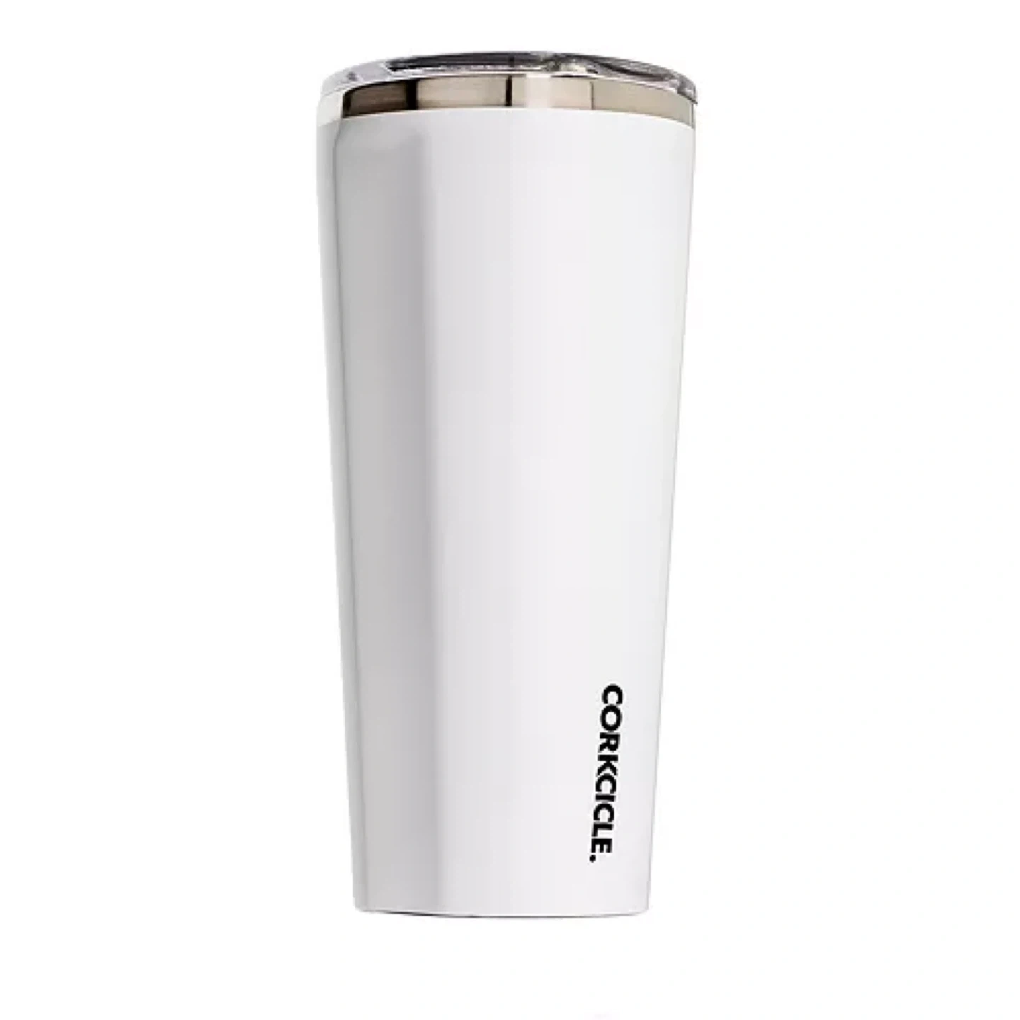 This is a white Corkcicle tumbler with a secure lid. It's made of durable material to keep drinks at the desired temperature. Its simple design makes it suitable for everyday use.