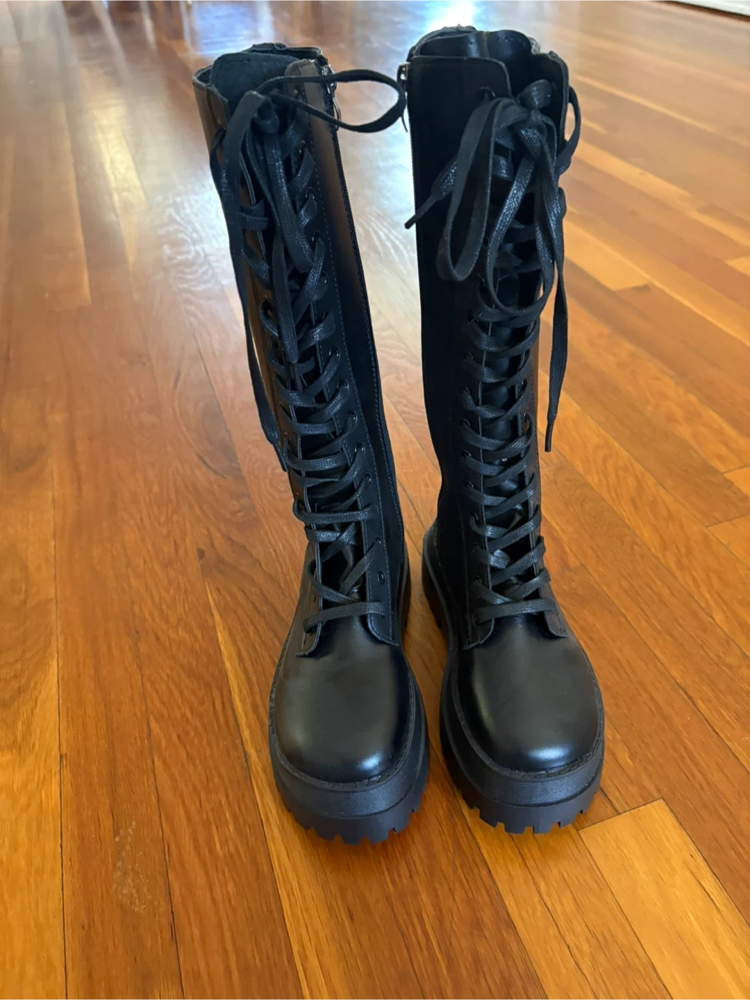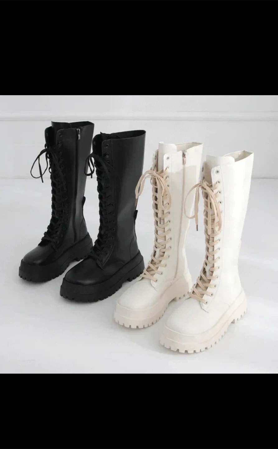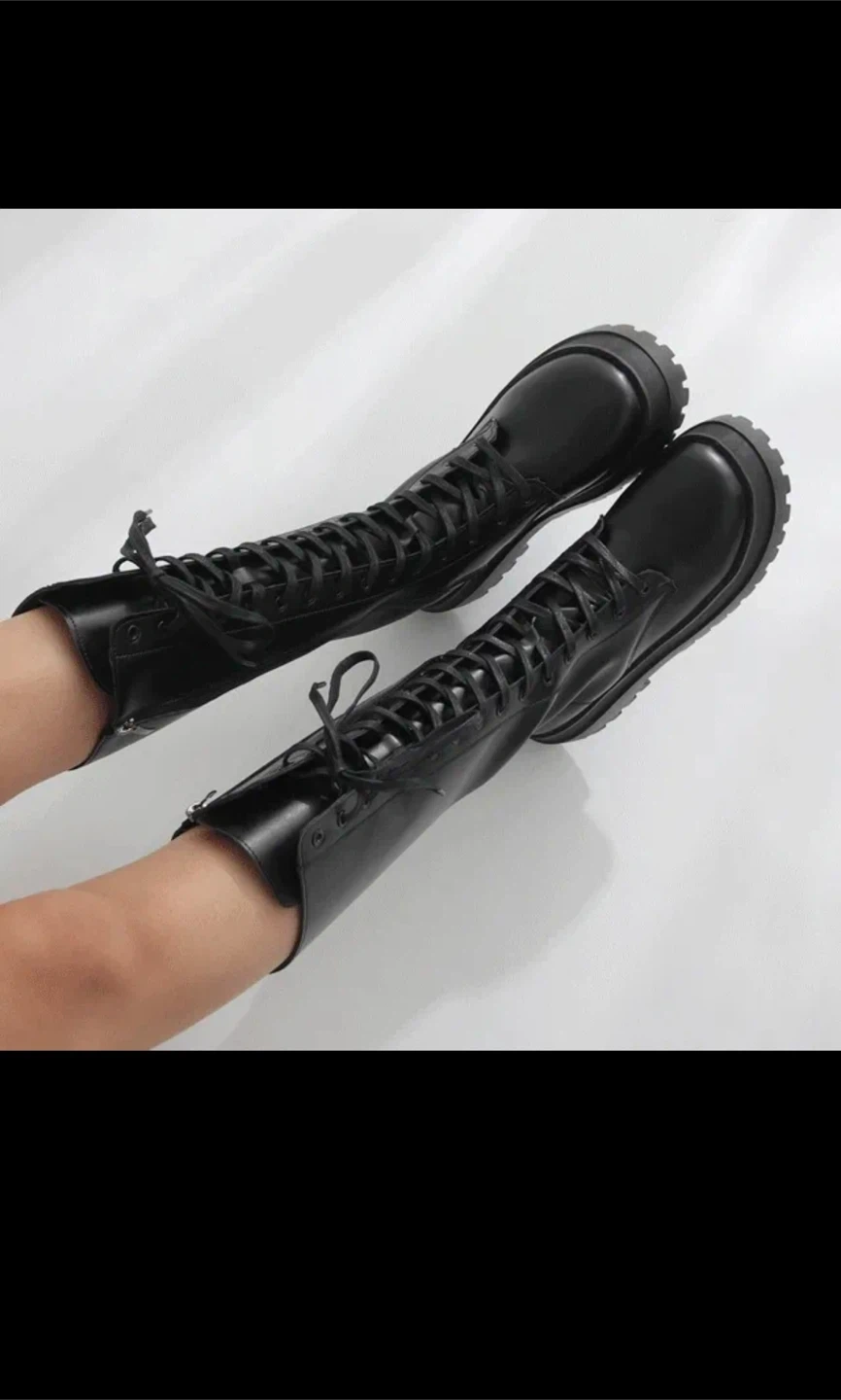 These black knee-high boots feature a lace-up front and a chunky platform sole. They also have a convenient side zipper for easy on and off. Synthetic leather material.