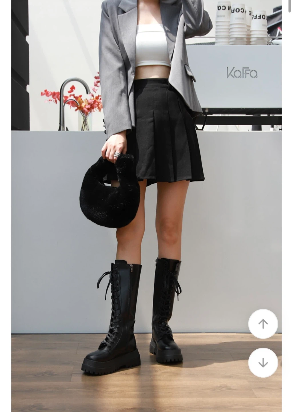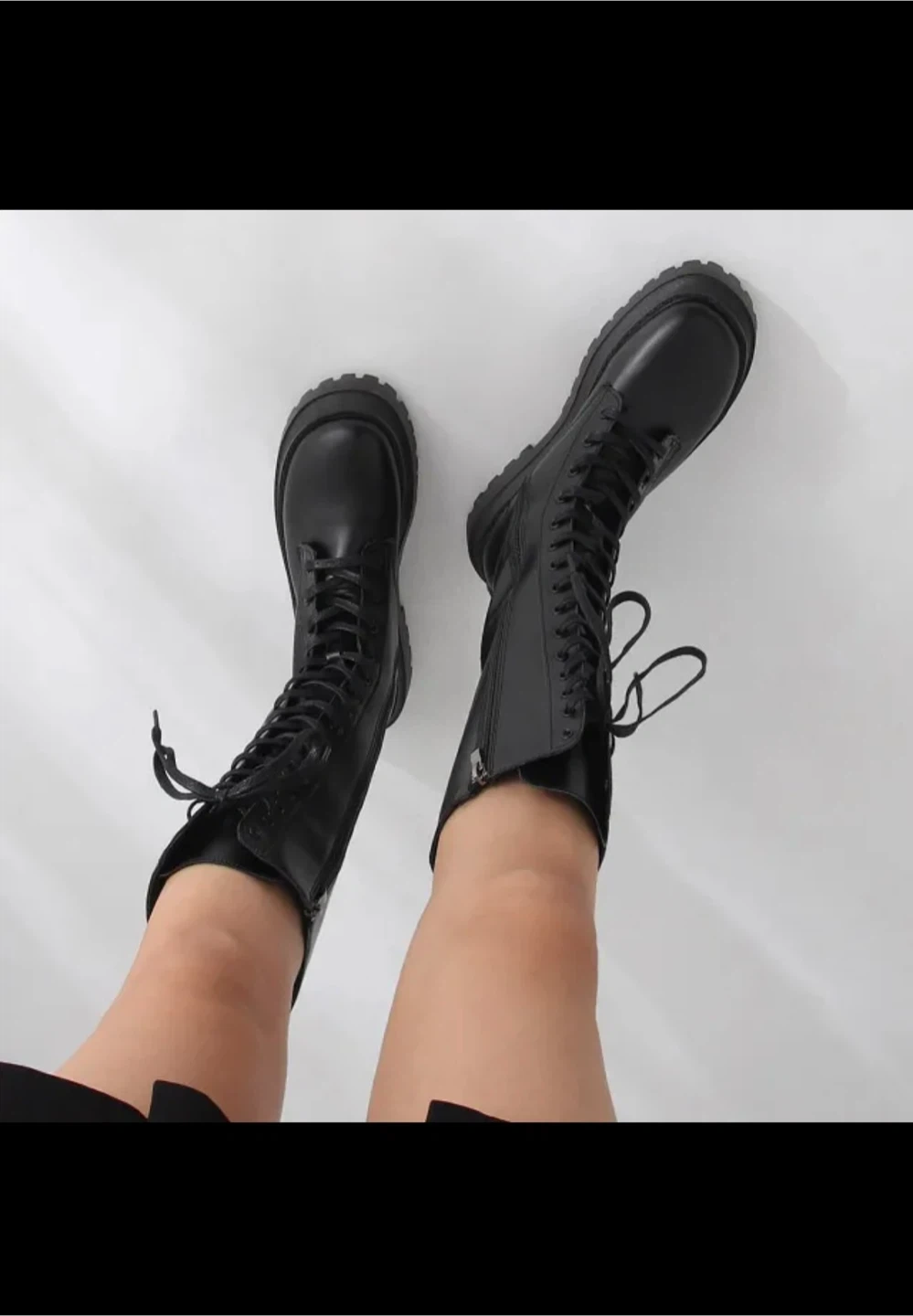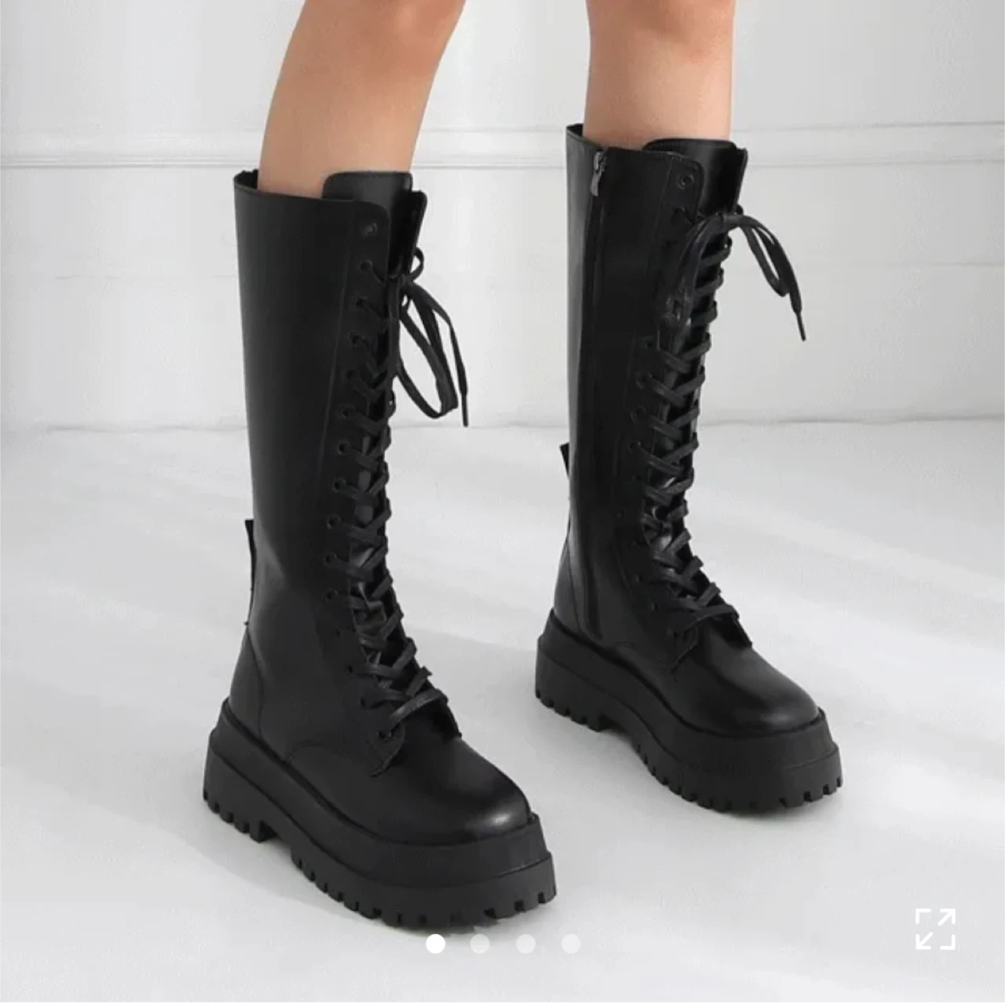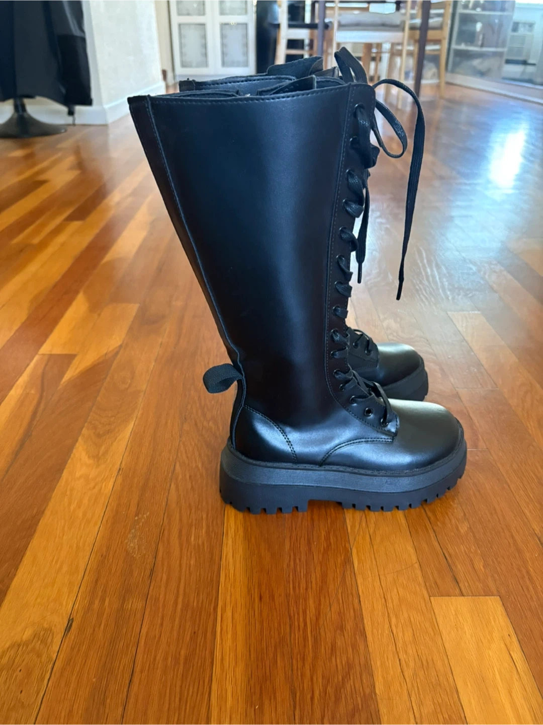 These black knee-high boots feature a lace-up front and a chunky platform sole. They also have a convenient side zipper for easy on and off. Synthetic leather material.