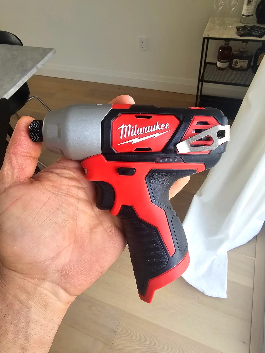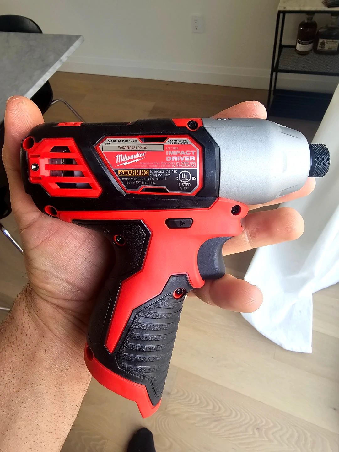 This is a Milwaukee M12 Impact Driver. It's a compact tool designed for driving screws and bolts. Great for quick fixes around the house or in the workshop!
