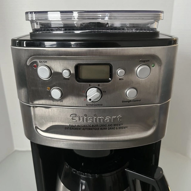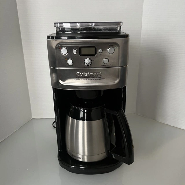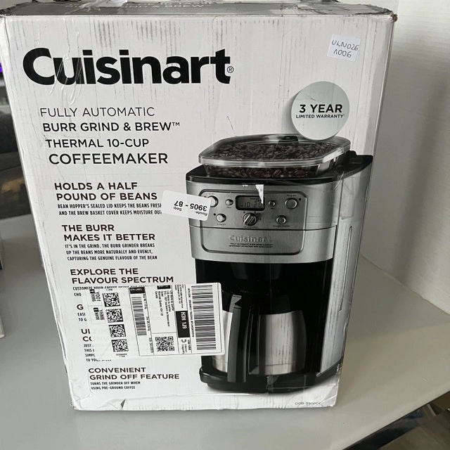 Enjoy freshly ground coffee every morning with this Cuisinart Burr Grind & Brew 10-Cup Thermal Coffeemaker. This fully automatic coffeemaker grinds whole beans right before brewing for the freshest flavour. It has a thermal carafe to keep your coffee hot, and a convenient grind-off feature for using pre-ground coffee. Additional Specs: * Fully automatic burr grind & brew * Thermal 10-cup coffeemaker * Holds a half pound of beans * Convenient grind-off feature for using pre-ground coffee. It is in excellent condition and ready to enhance your coffee experience.