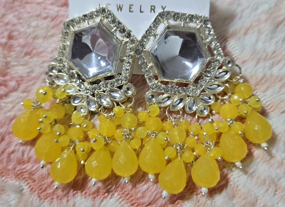 Sparkly earrings, silver-tone setting with clear stones. Yellow round and teardrop beads dangle nicely. Add a pop of color to your outfit.