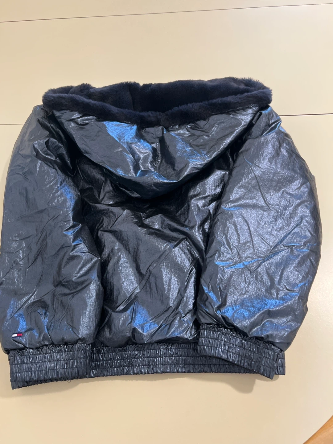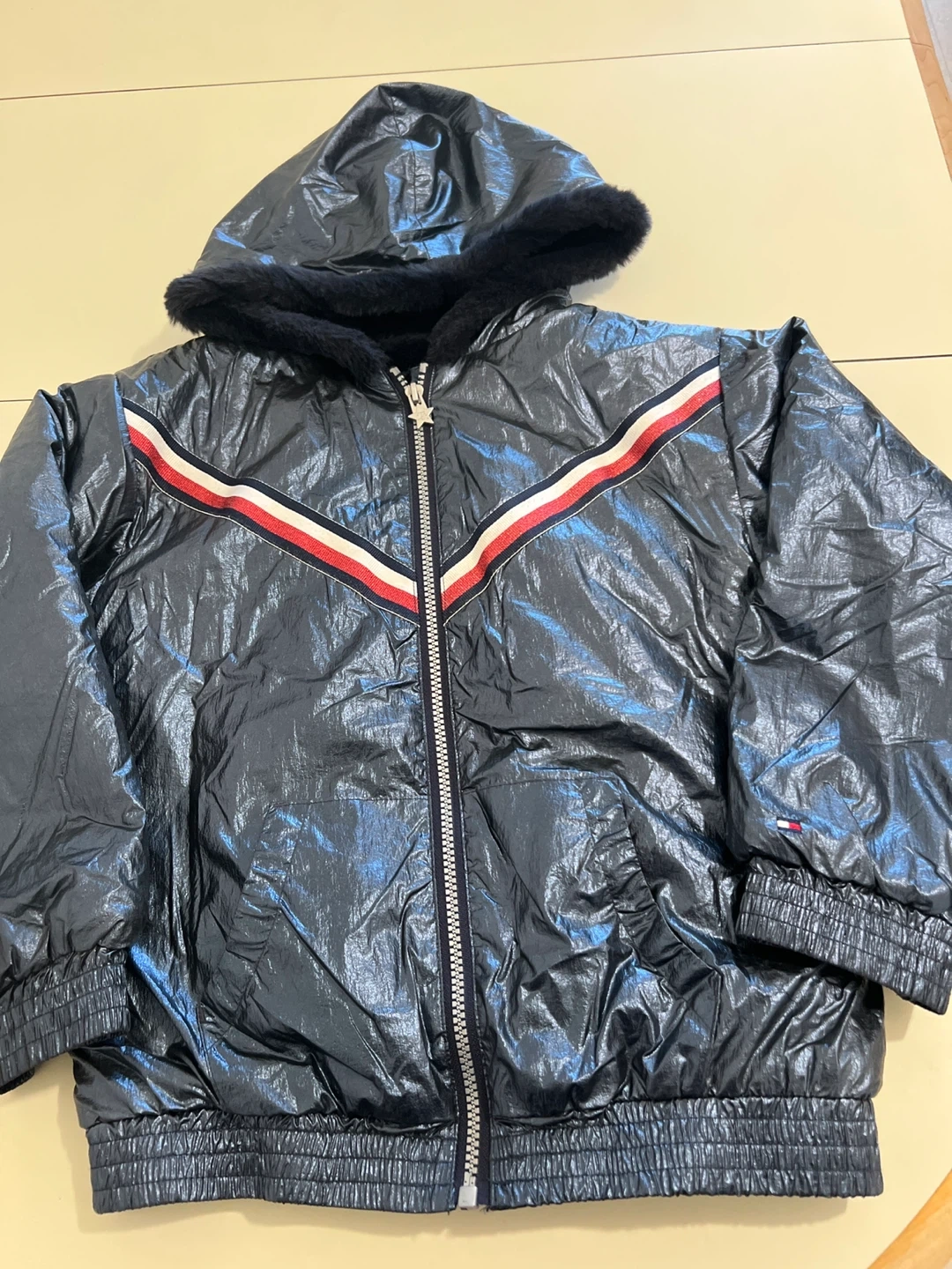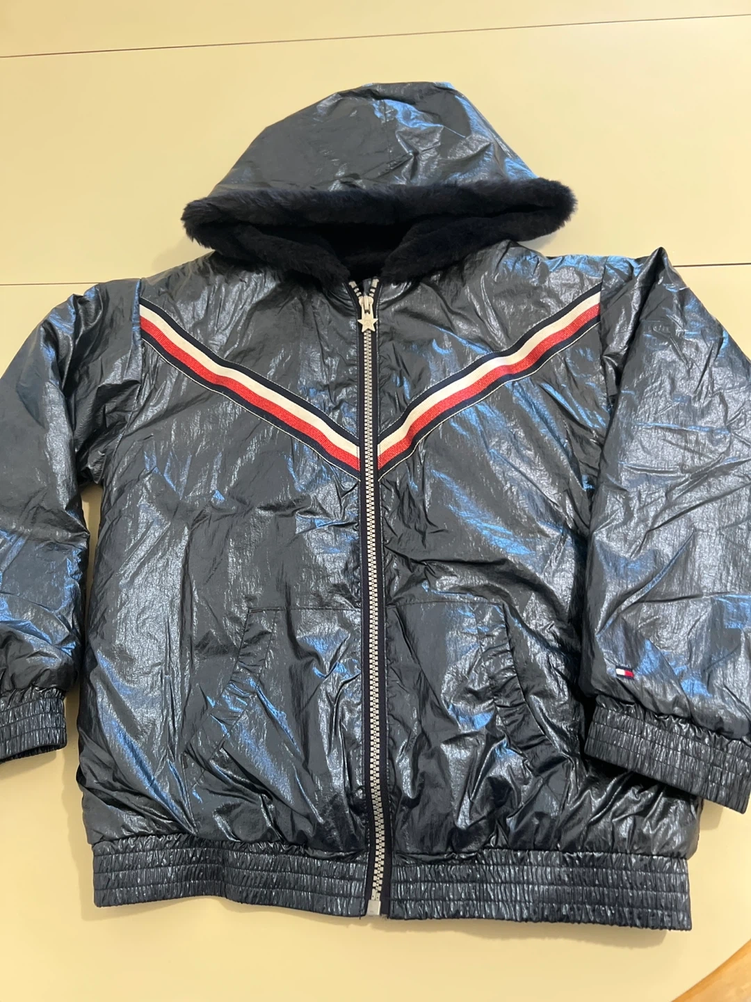 Selling a Tommy Hilfiger puffer jacket! It's in great condition and perfect for staying warm and stylish. Features a hood with faux fur trim and the classic Tommy Hilfiger stripe design.
