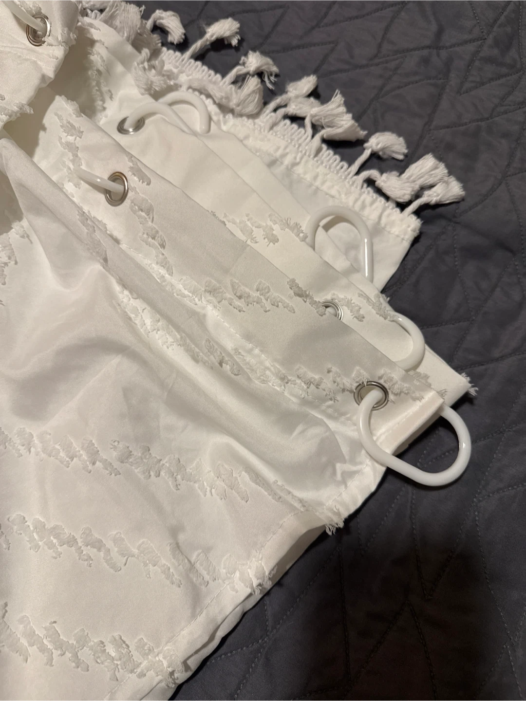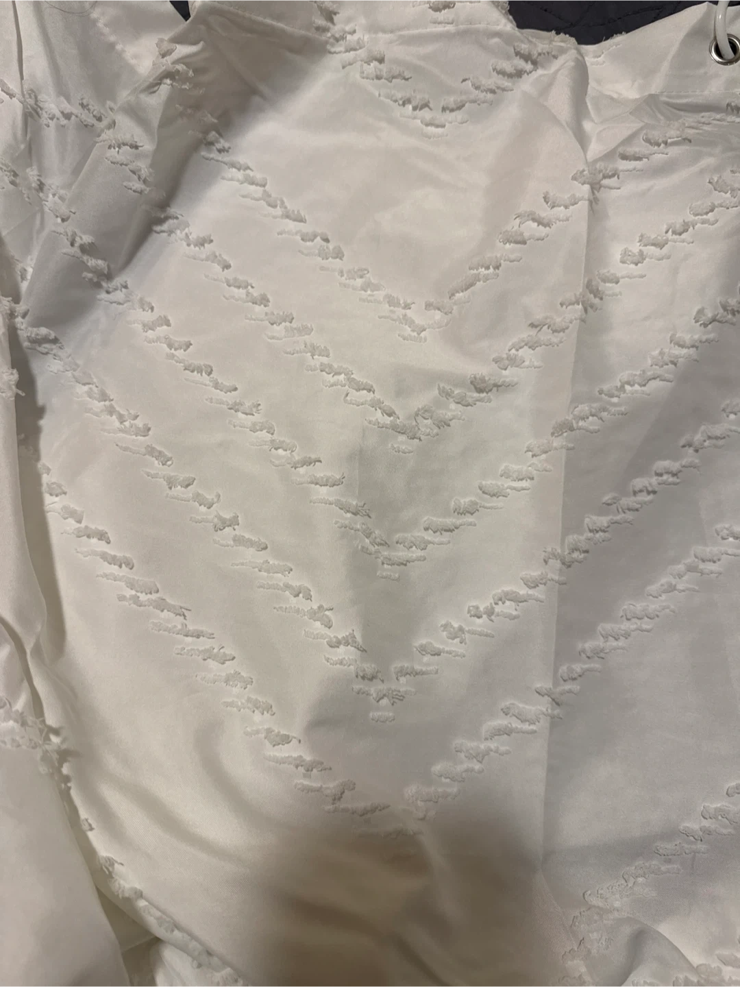 White shower curtain with a textured chevron pattern. It's finished with a decorative tassel fringe along the top. Includes plastic curtain rings. 72 inches wide. (I have 2 of them. Each for $5)