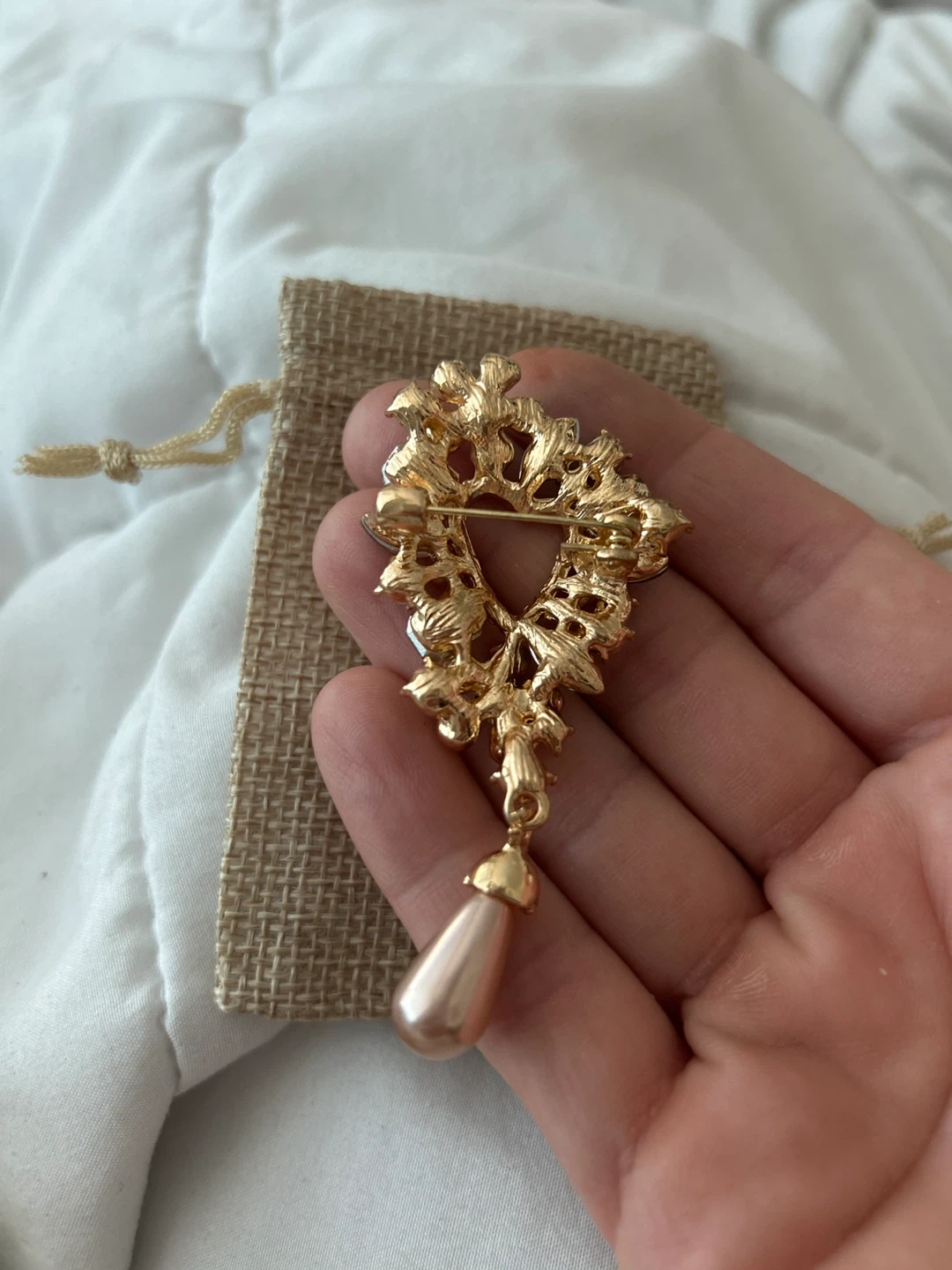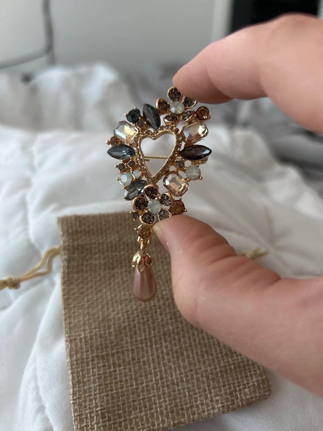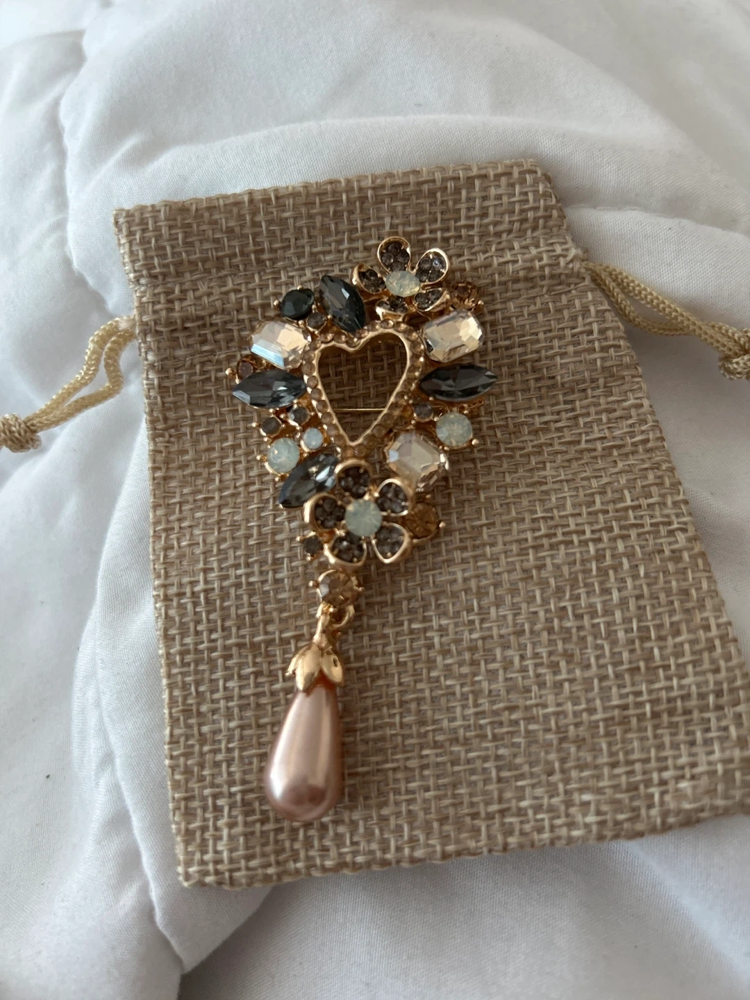 Selling a beautiful vintage-style brooch! It features a heart-shaped design with sparkling stones and a faux pearl drop. It comes with its original pouch, making it a