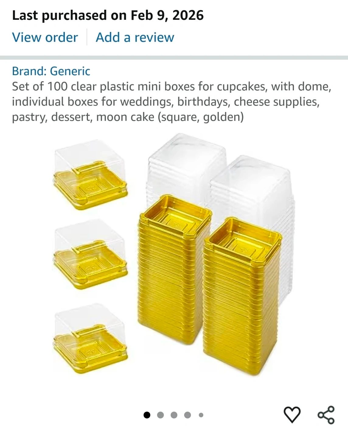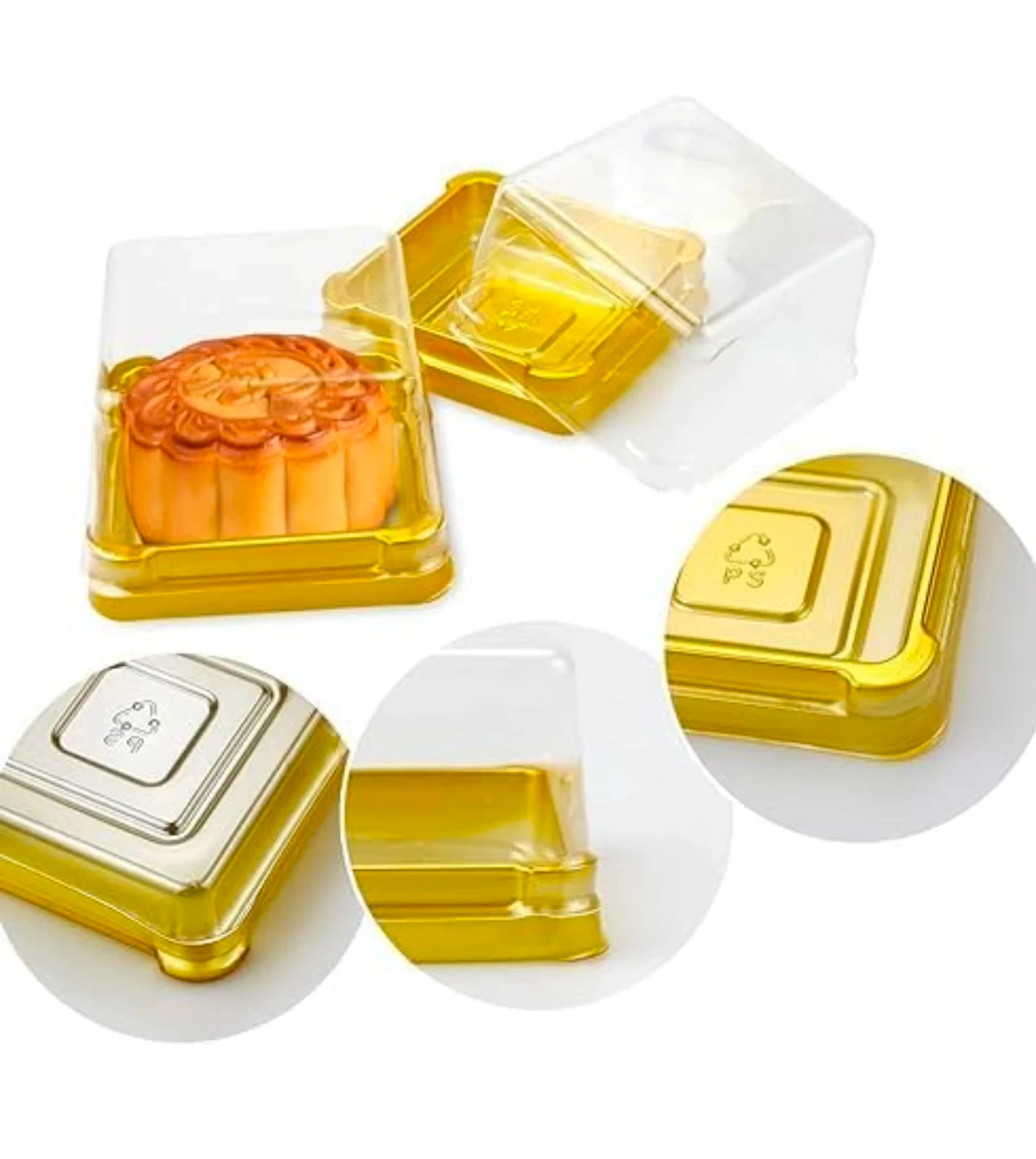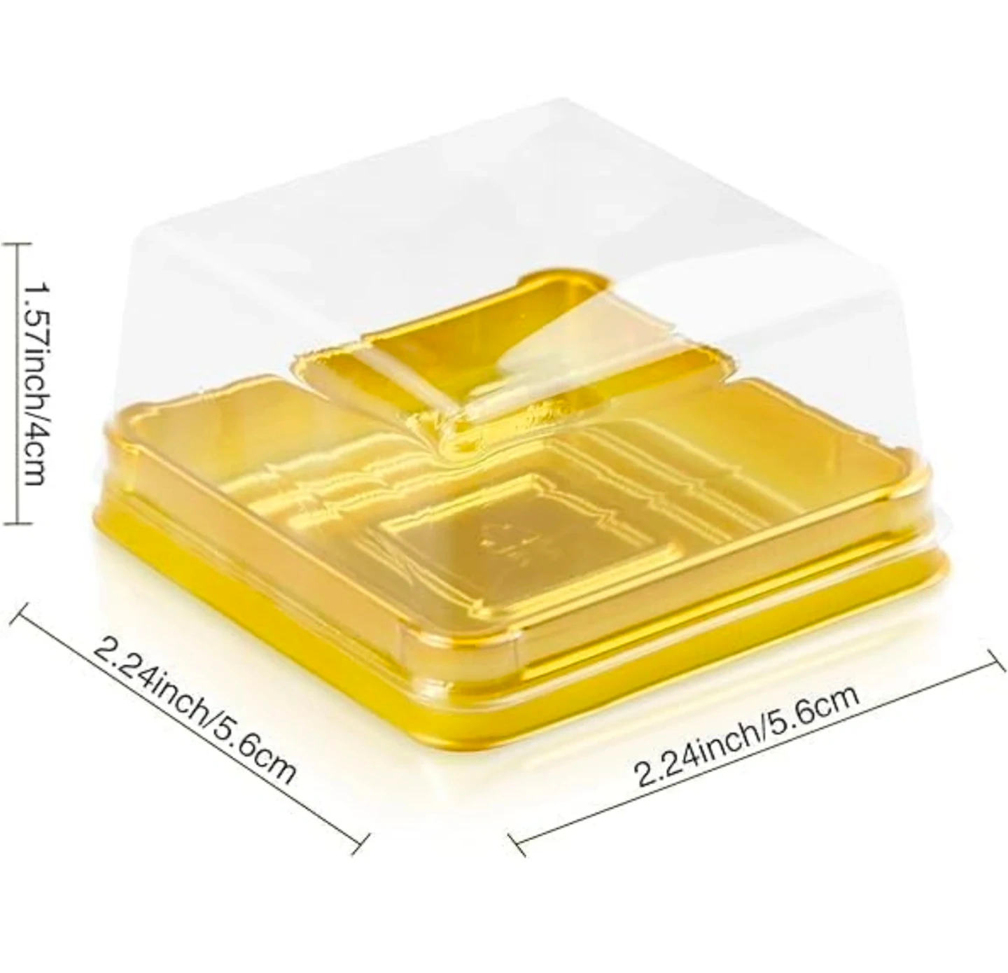 Set of 100 individual clear plastic dessert boxes with gold bases. Each box measures 2.24 x 2.24 x 1.57 inches. They're perfect for cupcakes, pastries, and other small treats. These boxes are great for parties or selling baked goods!