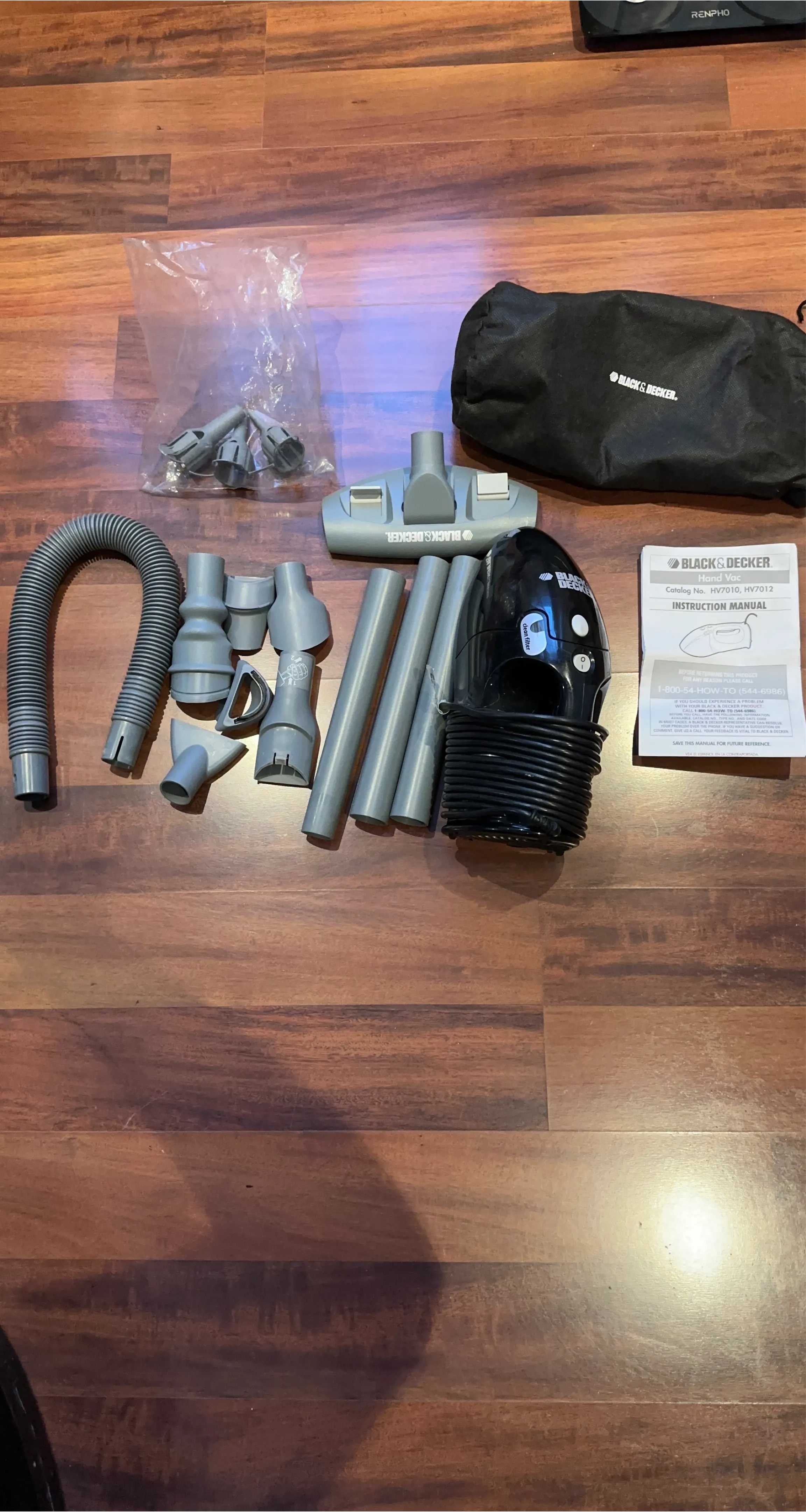 This is a Black & Decker Hand Vac, model HV7010 or HV7012. It comes with various attachments and a carrying bag. Includes crevice tool, brush tool, hose, and extension tubes. The instruction manual is also included.