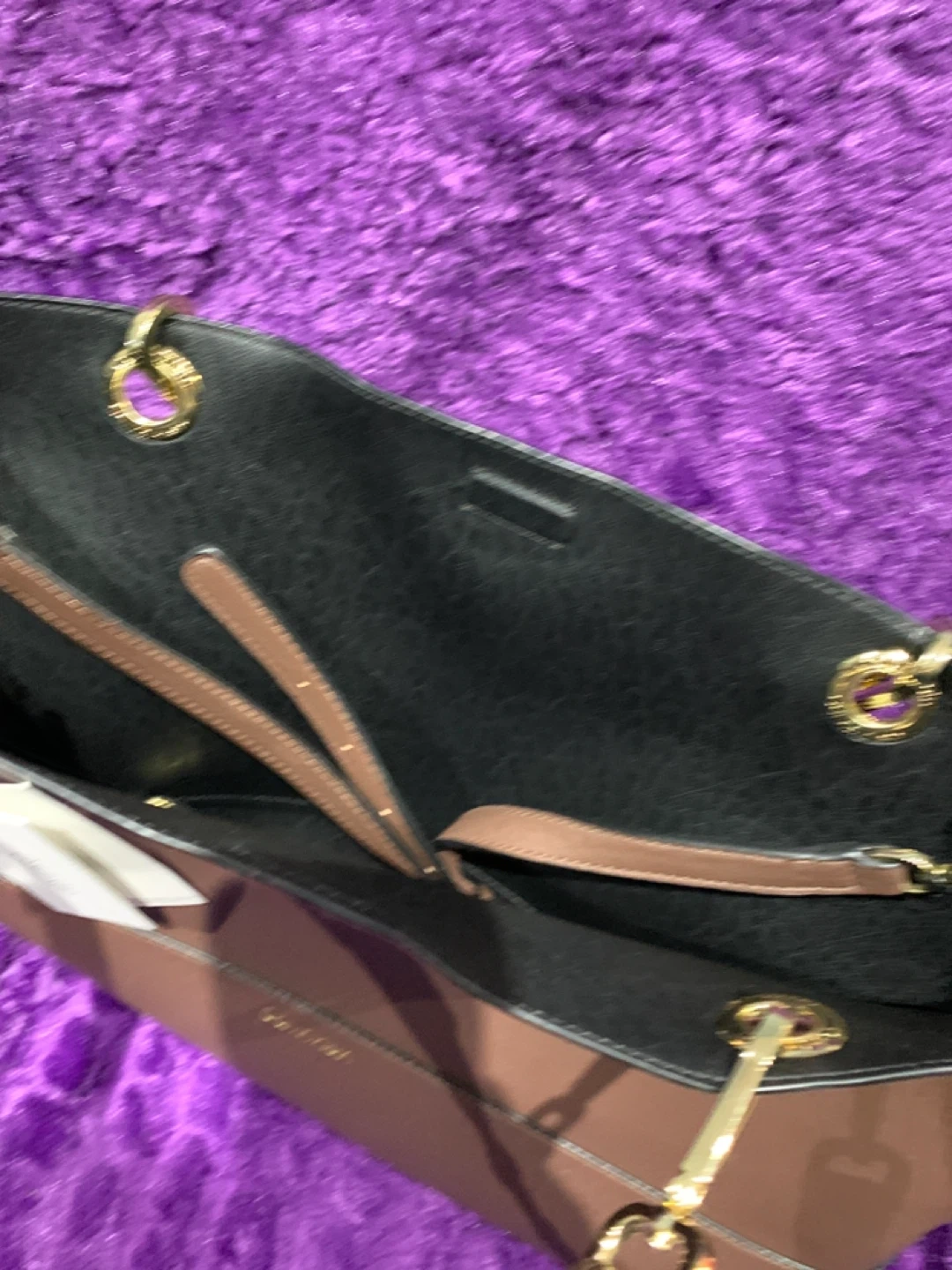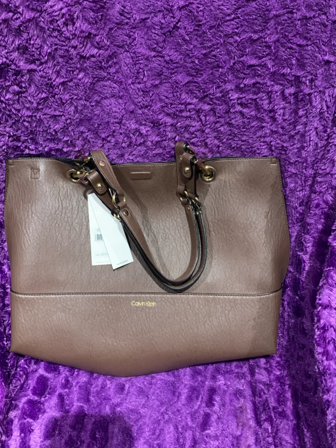 A Calvin Klein tote bag in a brown hue. It's made from faux leather with gold-tone hardware. This spacious bag is perfect for everyday use. SRP $218