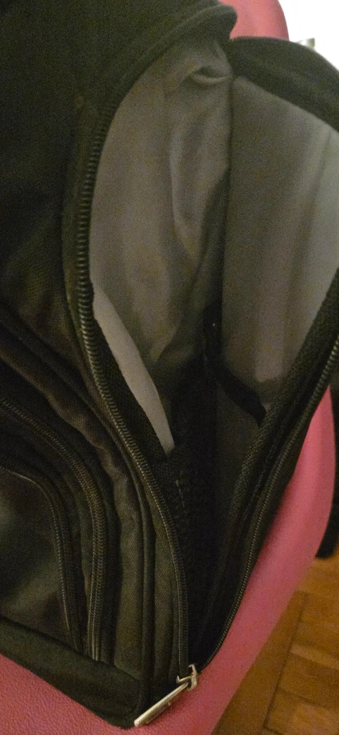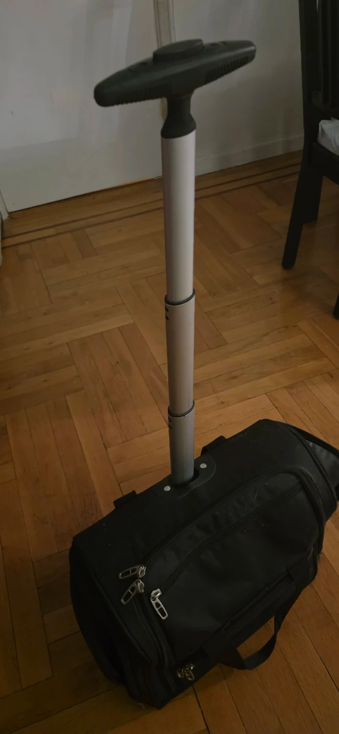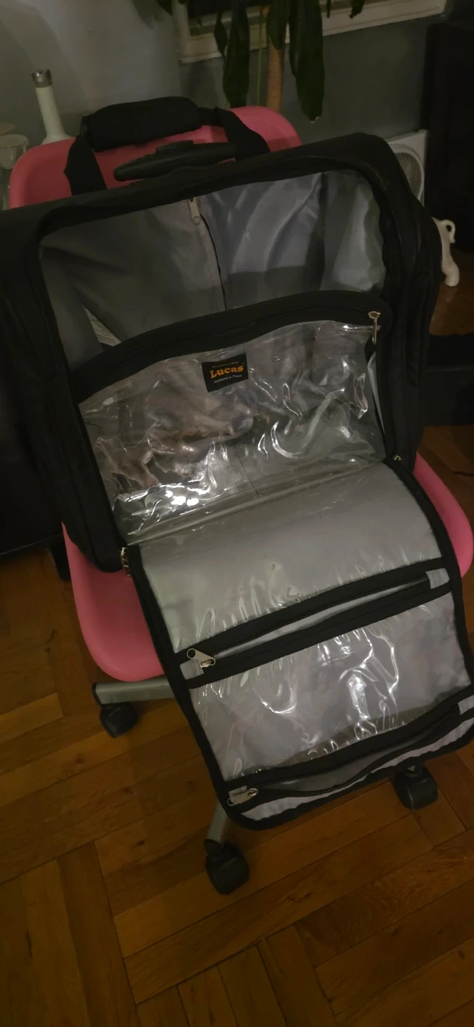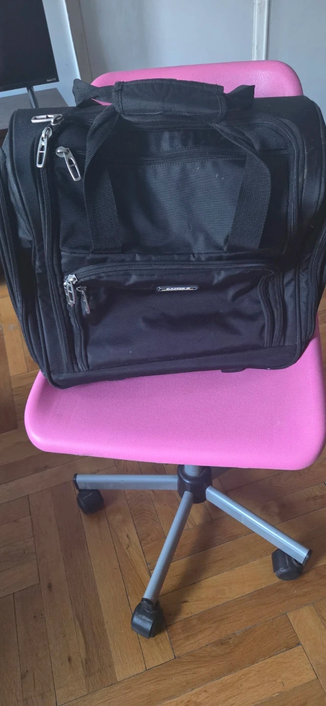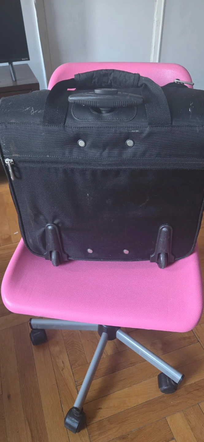 This is a black rolling carry-on bag. It features a telescoping handle and multiple zippered compartments. The interior includes clear pouches for organization. It's great for travel or work! Fits under your seat for airline travel.