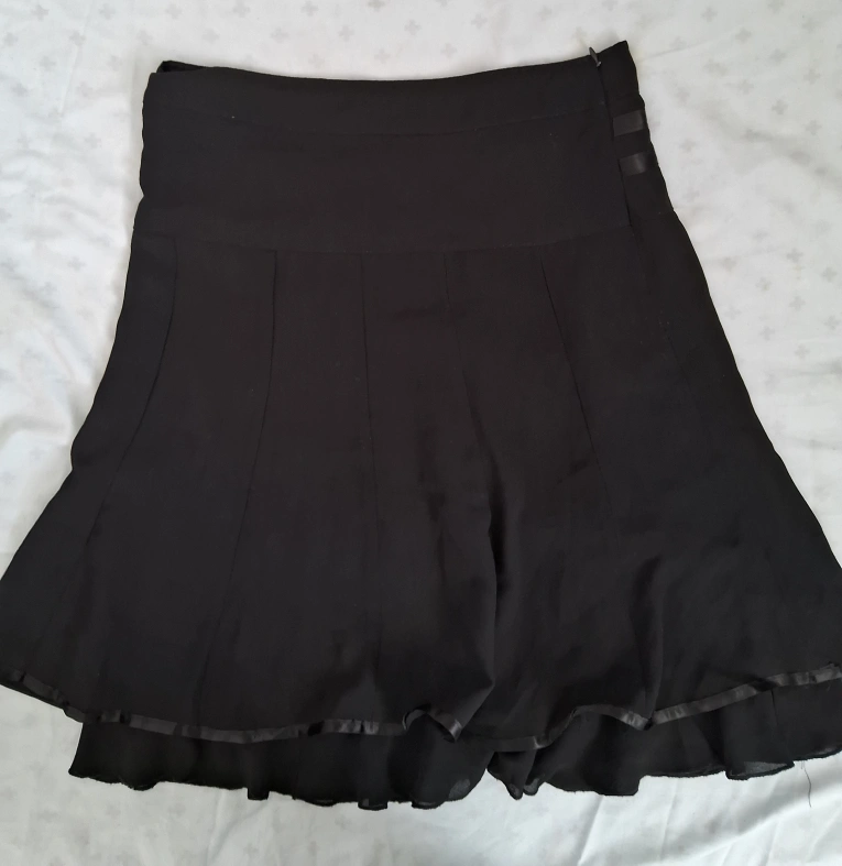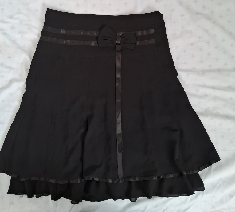 Stylish black A-line skirt. Features a double layer and a cute satin bow with zip. Great for casual or semi-formal occasions.