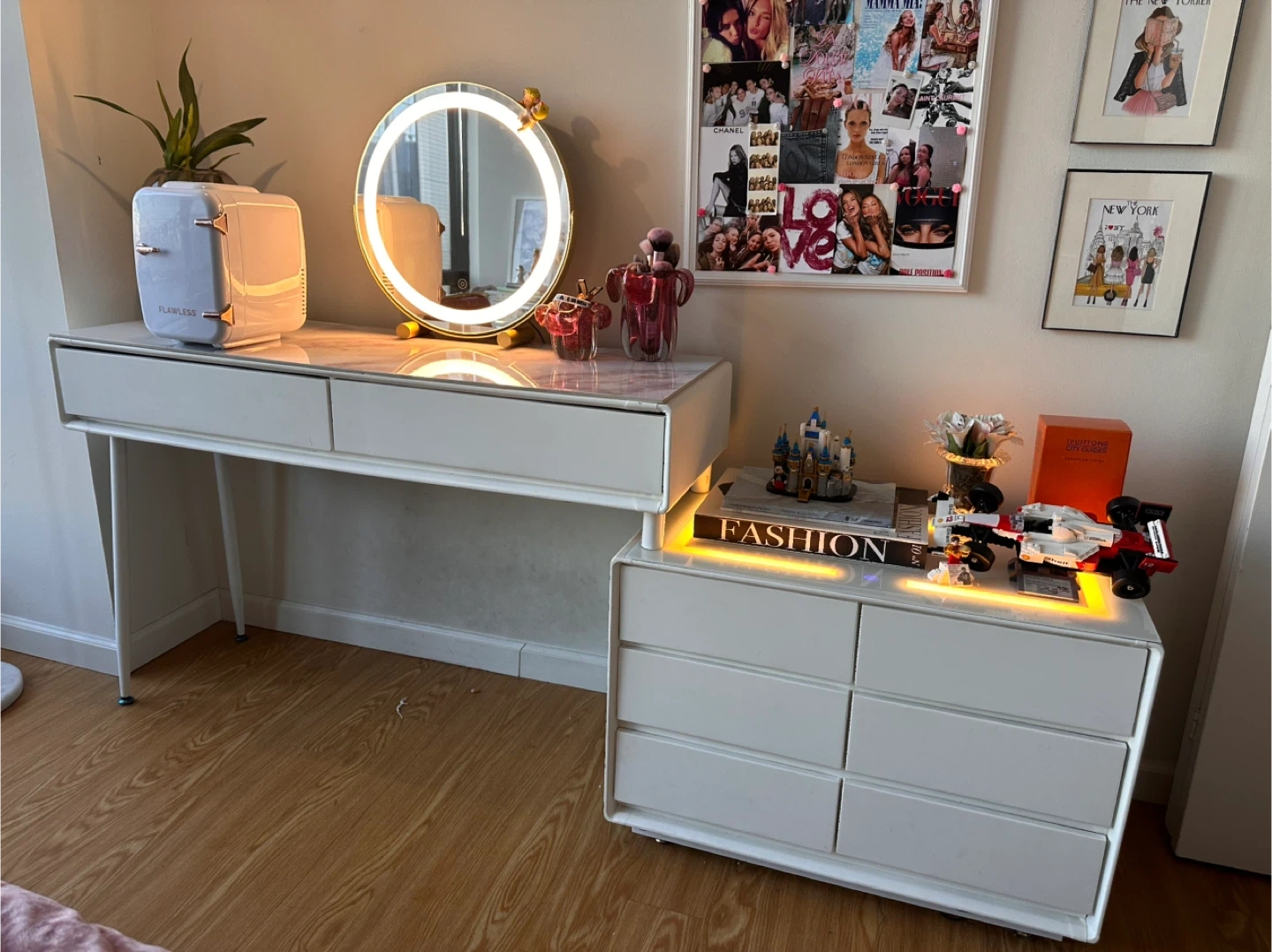 Multiple drawers for ample storage and wireless Bluetooth speaker. Great for organizing your beauty essentials!