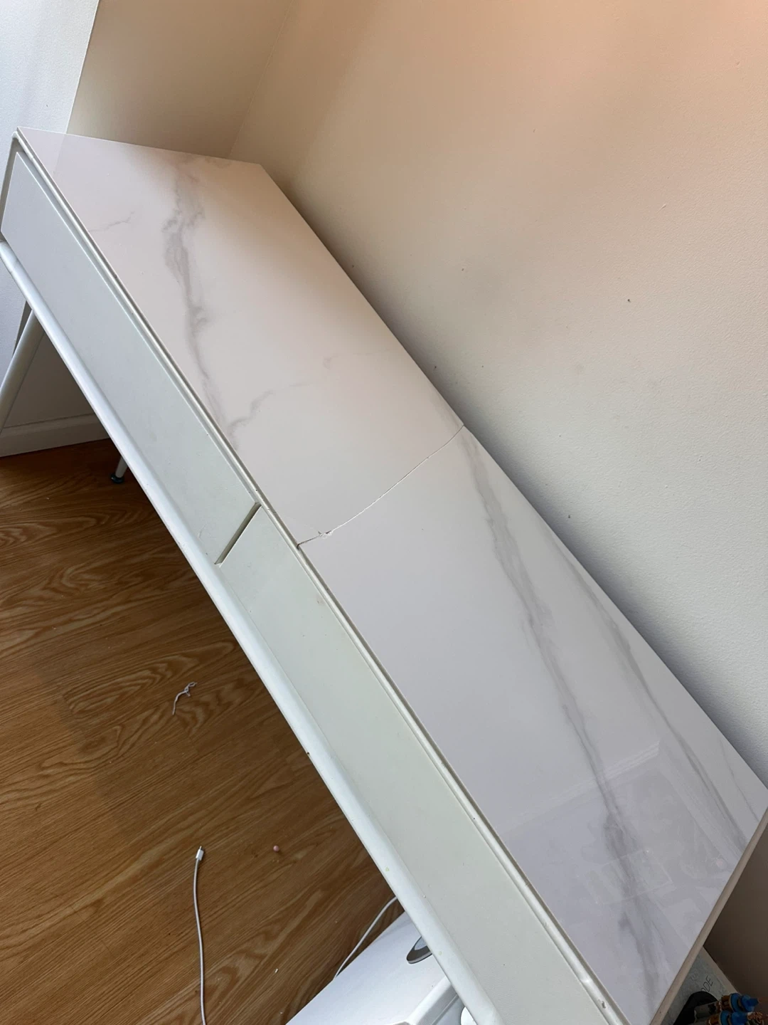 *the marble top has a crack (see 3rd picture) but It has been covered with a White Marble Contact Paper (see 4 and 5 picture) and is almost unnoticeable.