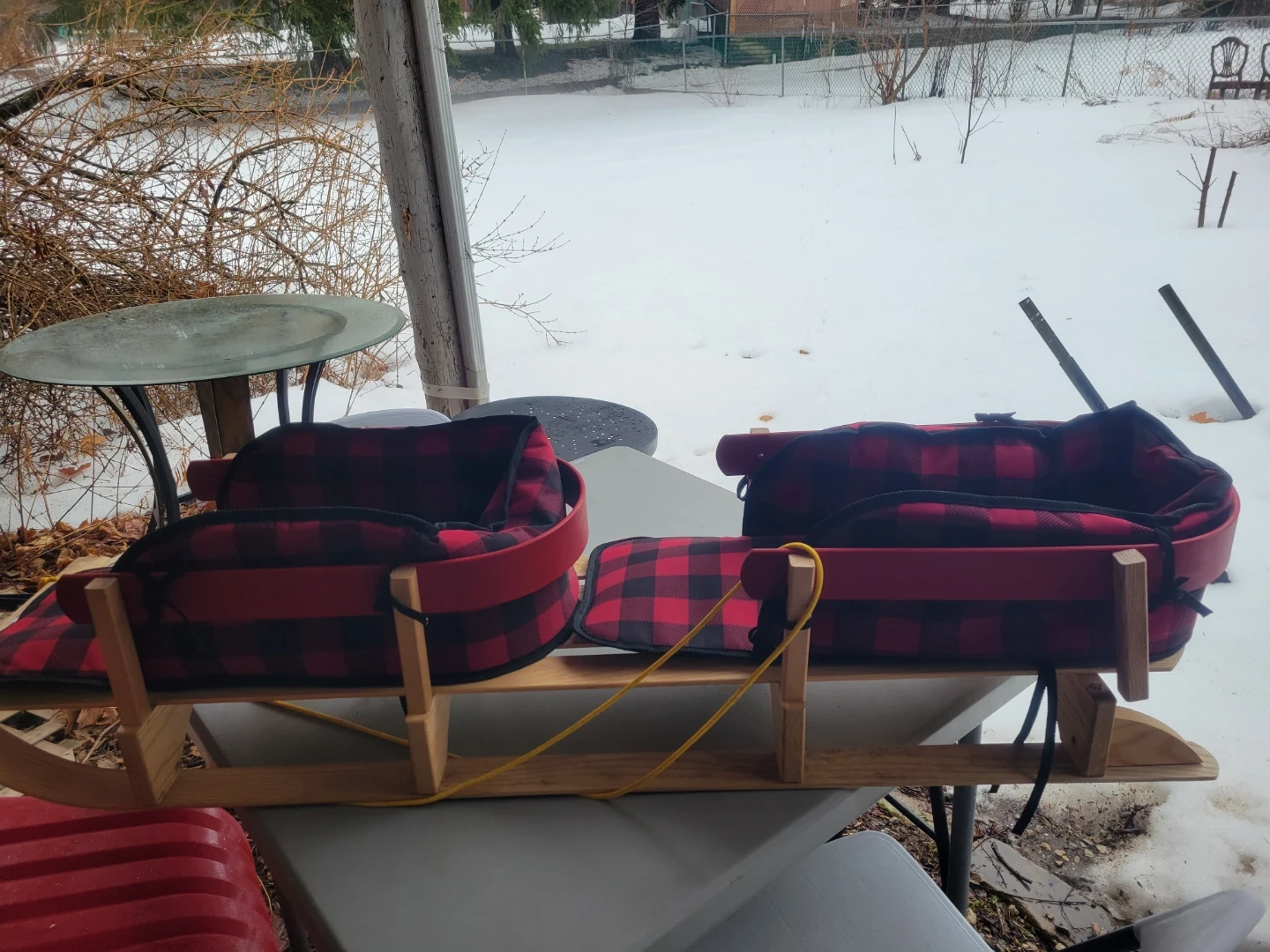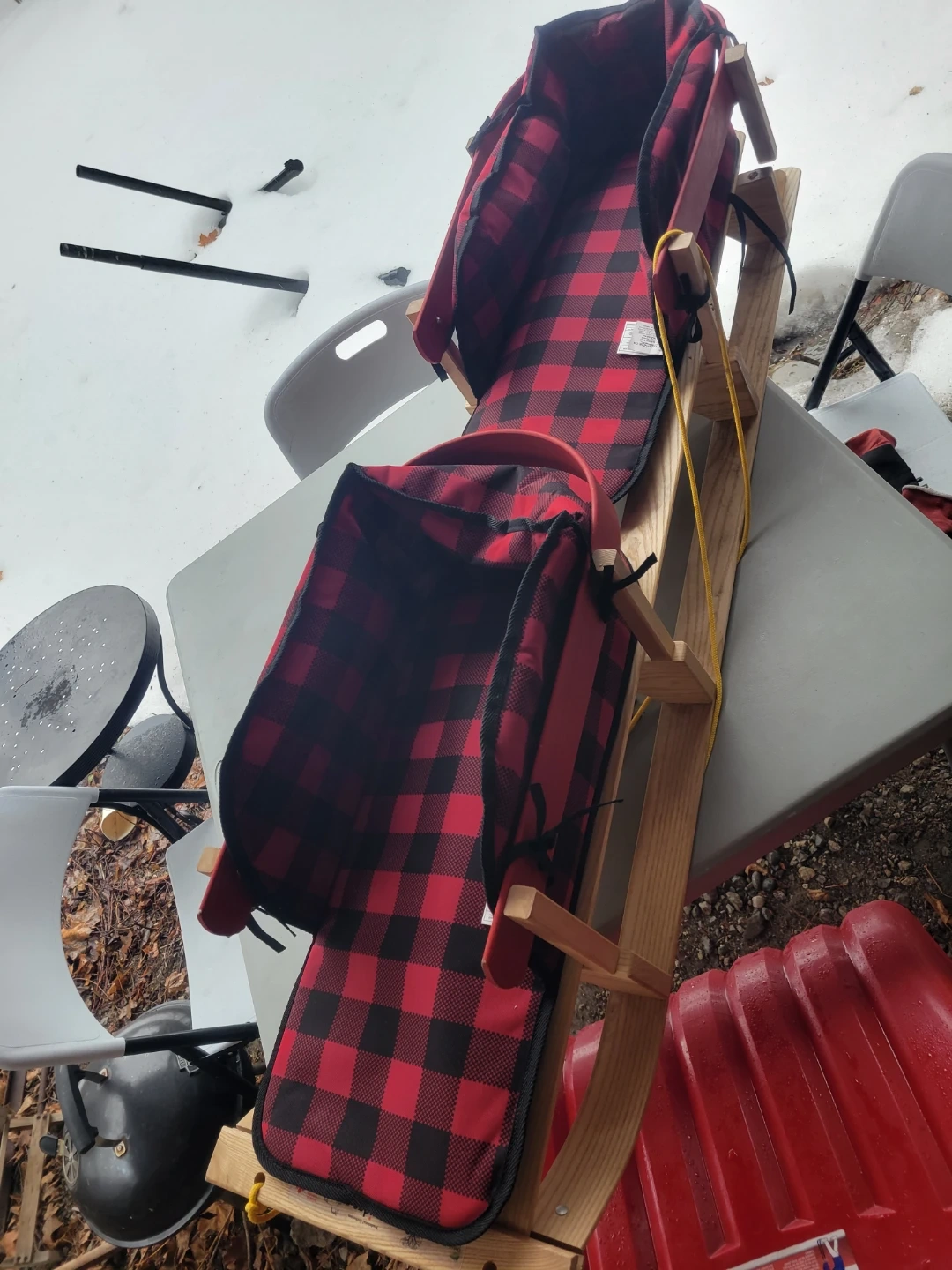 This is a classic wooden toboggan sled. It comes with two padded seats featuring a red and black buffalo plaid pattern. It's great for cruising down snowy hills! It's a double
