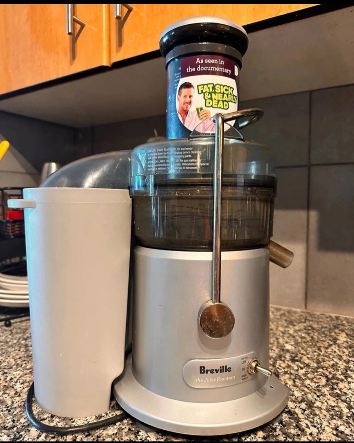 This Breville juicer makes fresh juice quickly! It's a powerful appliance for your kitchen. Its wide chute makes juicing fruits and veggies a breeze.