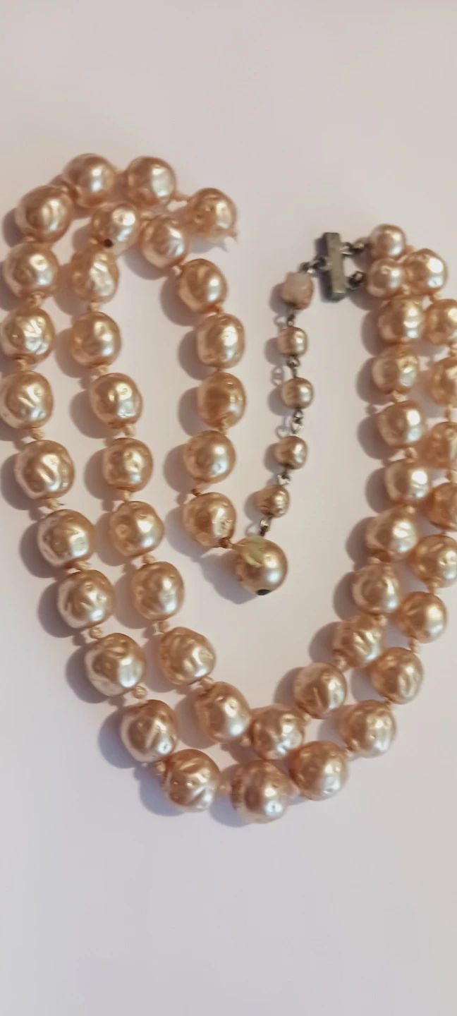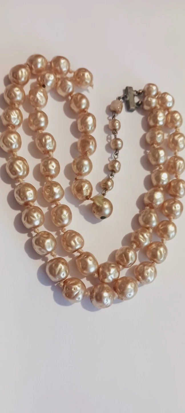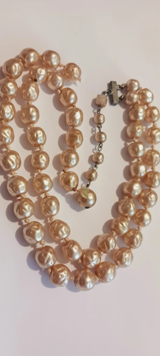 THIS IS A BROKEN OLD VINTAGE 1940s BAROQUE PEARL NECKLACE THAT I AM SELLING FOR THE PARTS OR JEWELRY PROJECTS. THE CLASP IS BROKEN. SELLING AS IS. ( NOT SURE IF THESE ARE MIRIAM HASKEL BAROQUE PEARLS BECAUSE HALF OF THE CLASP IS MISSING, BUT I DID HAVE EXACTLY THE SAME SIGNED MIRIAM HASKELL PEARL NECKLACE THAT WAS SOLD BEFORE). The pearls are a creamy, peachy-pink color. Selling as is.