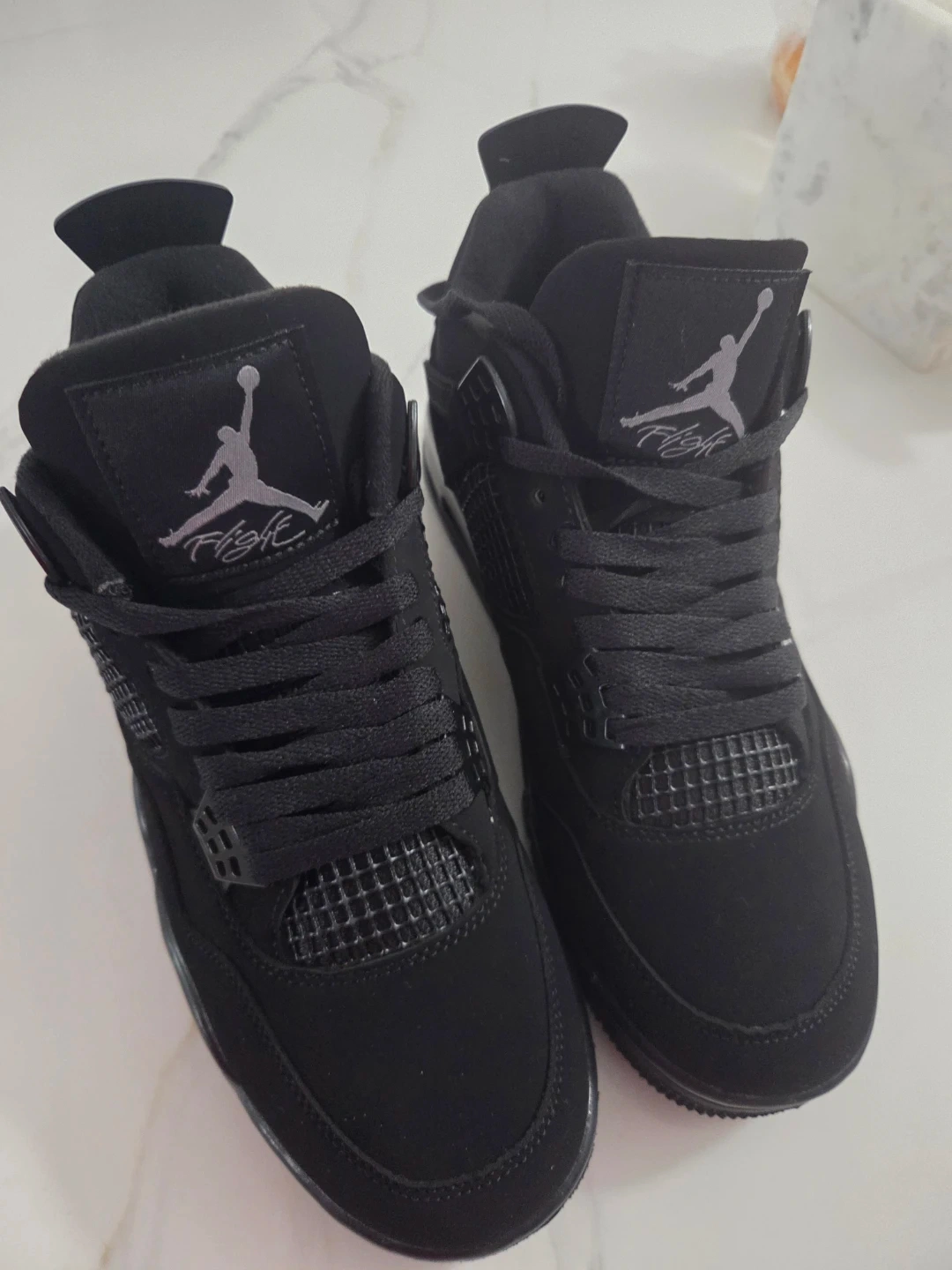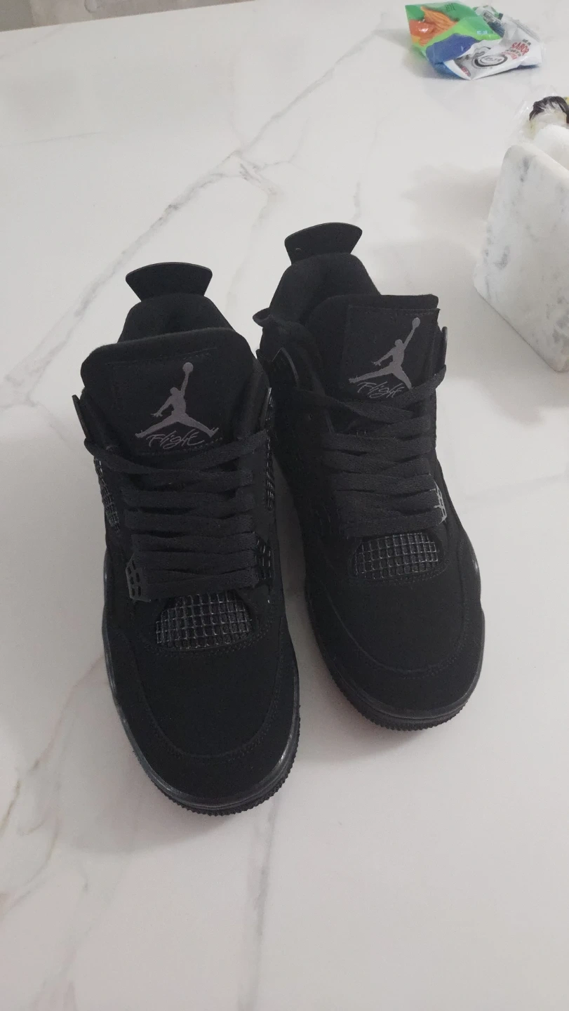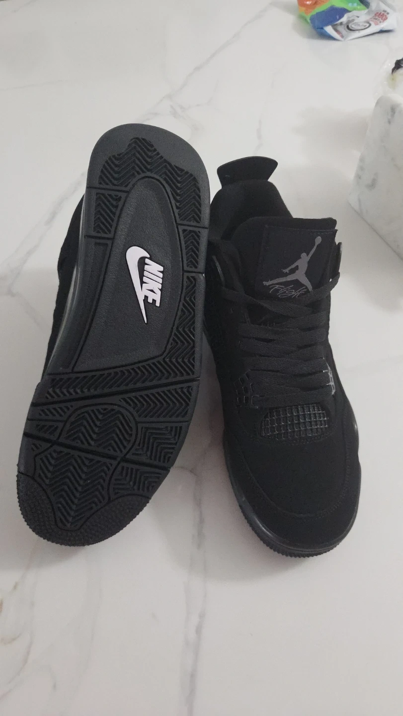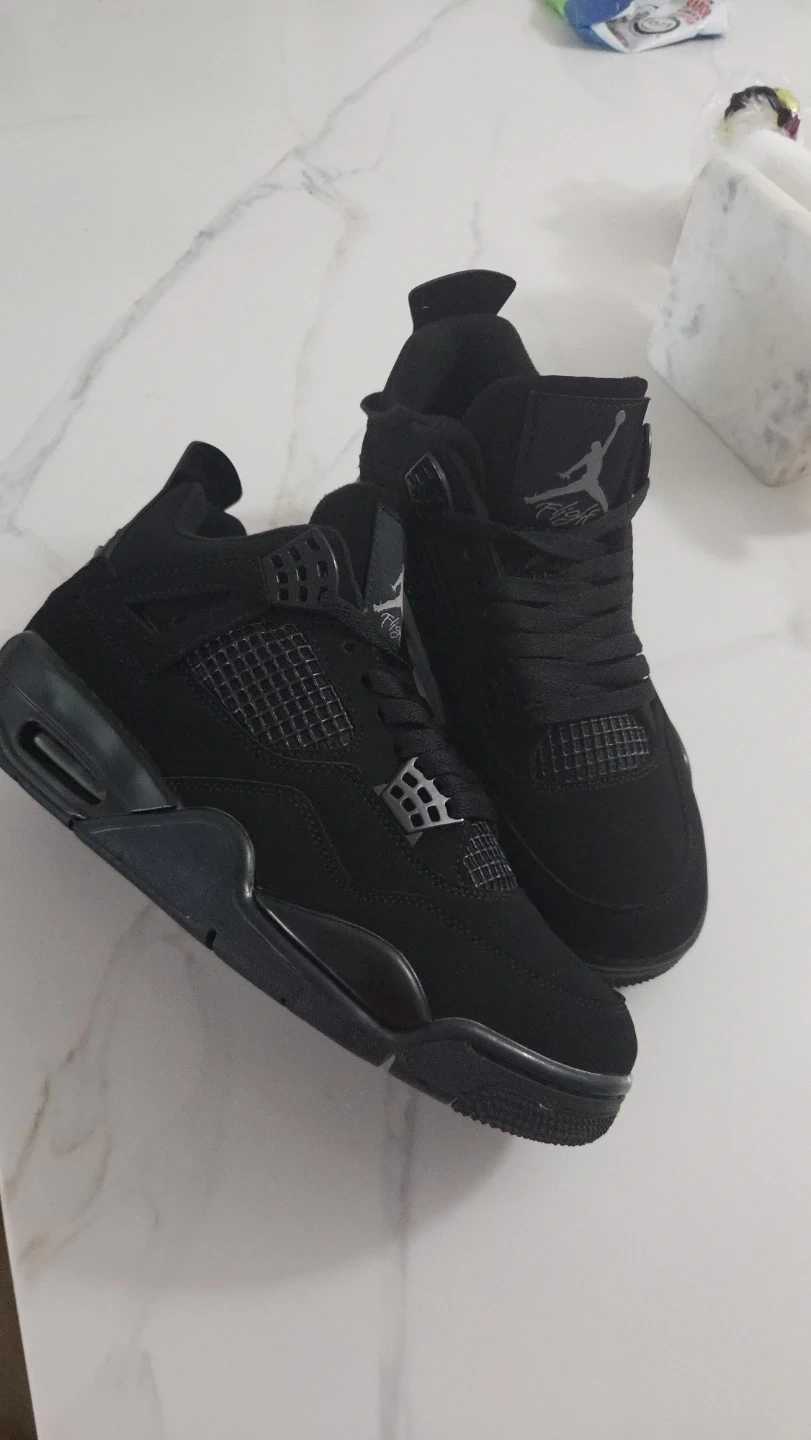 These black Air Jordan 4 sneakers feature the iconic Jumpman logo and Nike branding. They're made with a combination of suede and synthetic materials for durability. The sole is black rubber with a visible Nike swoosh. These shoes are a classic design for any sneaker enthusiast!