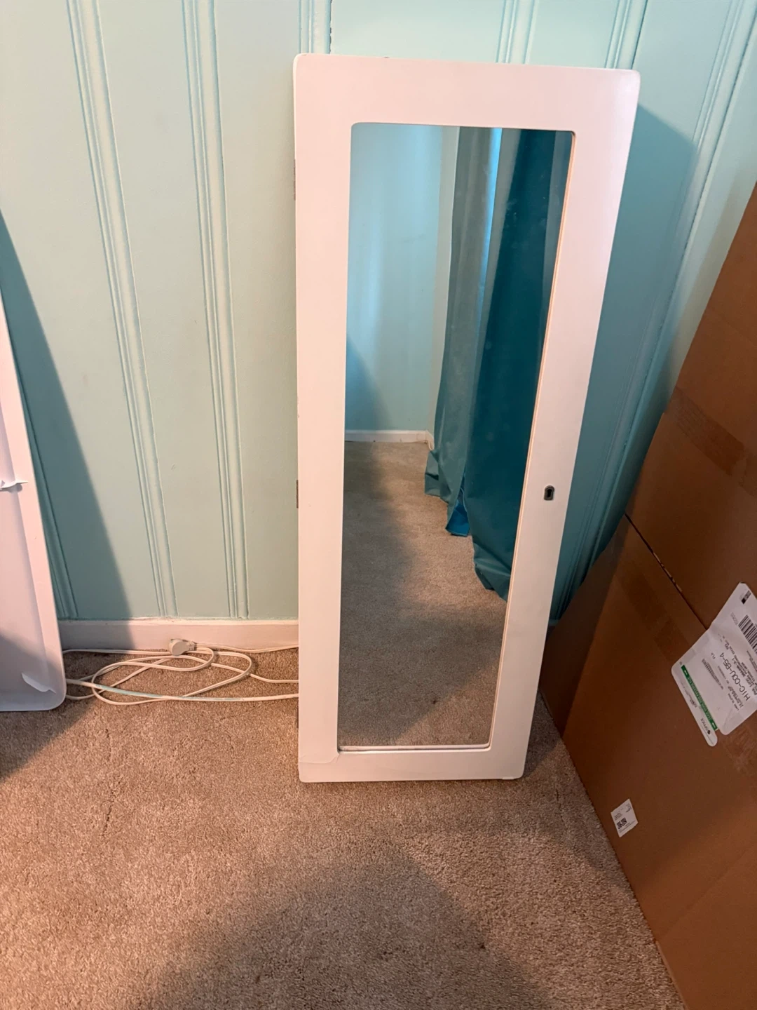 White jewelry armoire with a full-length mirror on the door. It features multiple hooks and compartments for organizing your jewelry and accessories. This armoire is designed for wall mounting or can be hung on a door. Slight damage on bottom right corner but doesn’t affect function and isn’t very noticeable